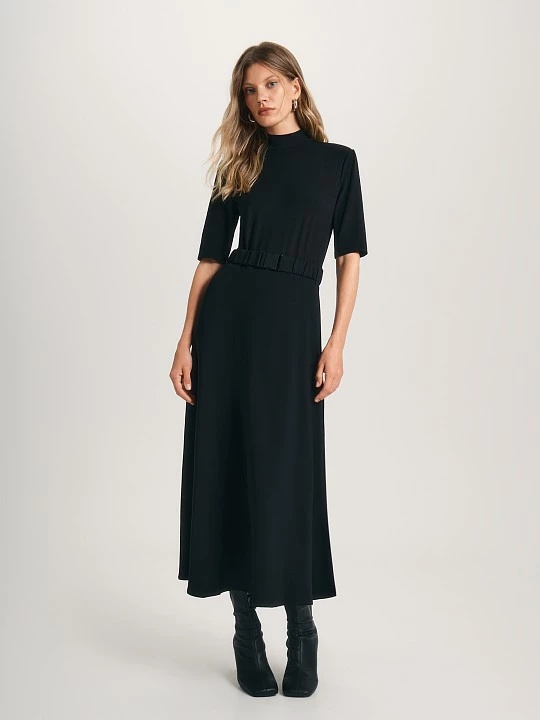 Модель длины миди выполнена с отрезным воротником-стойкой и застежкой сзади на потайную молнию. Втачной короткий рукав позволяет сразу подобрать к платью жакет из широкого ассортимента коллекции. Легкое расклешение нижней части платья, выполненной из высокотехнологичного полиэстера, обеспечивает правильную посадку по бедрам. Пояс из основной ткани с надежной пряжкой-фаст, выполненный на резинке, дополнительно подчеркивает талию. Модель комбинированная, для верха платья выбрали супер-эластичный вискозный трикотаж, для низа - качественный полиэстер с добавлением спандекса. Благодаря такому сочетанию изделие формоустойчиво, долговечно, воздухопроницаемо и тактильно приятно. Таинственный черный притягивает внимание, наши стилисты советуют усилить этот эффект аксессуарами с россыпью кристаллов и сумкой кросс-боди.