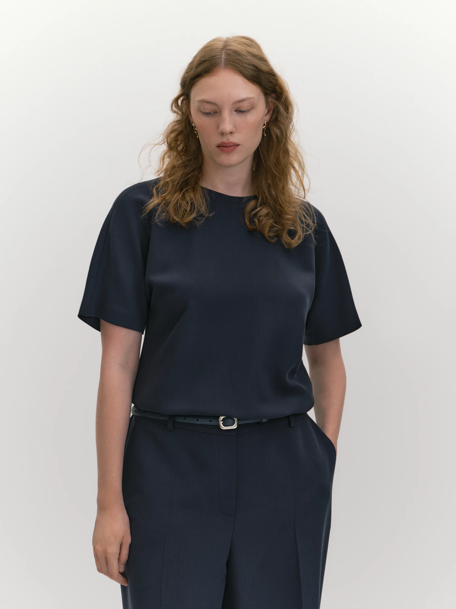 Выбрали для костюмной блузы эластичную вискозную ткань, демонстрирующую высокое тактильное качество. Выполнили модель с круглым вырезом и застежкой сзади на потайную молнию. Лаконичность модели подчеркнута отсутствием вытачек и рельефов, комфортную посадку по плечам и груди обеспечивает цельнокроеный рукав. Длина модели до середины бедра и небольшие боковые разрезы гарантируют правильную посадку по бедрам. Выбранный для блузы элегантный цвет Полное затмение (Total Eclipse) дает неограниченные возможности для создания образов самой разной стилистики, блуза будет востребована как классическая, офисная, нарядная, праздничная и даже новогодняя.