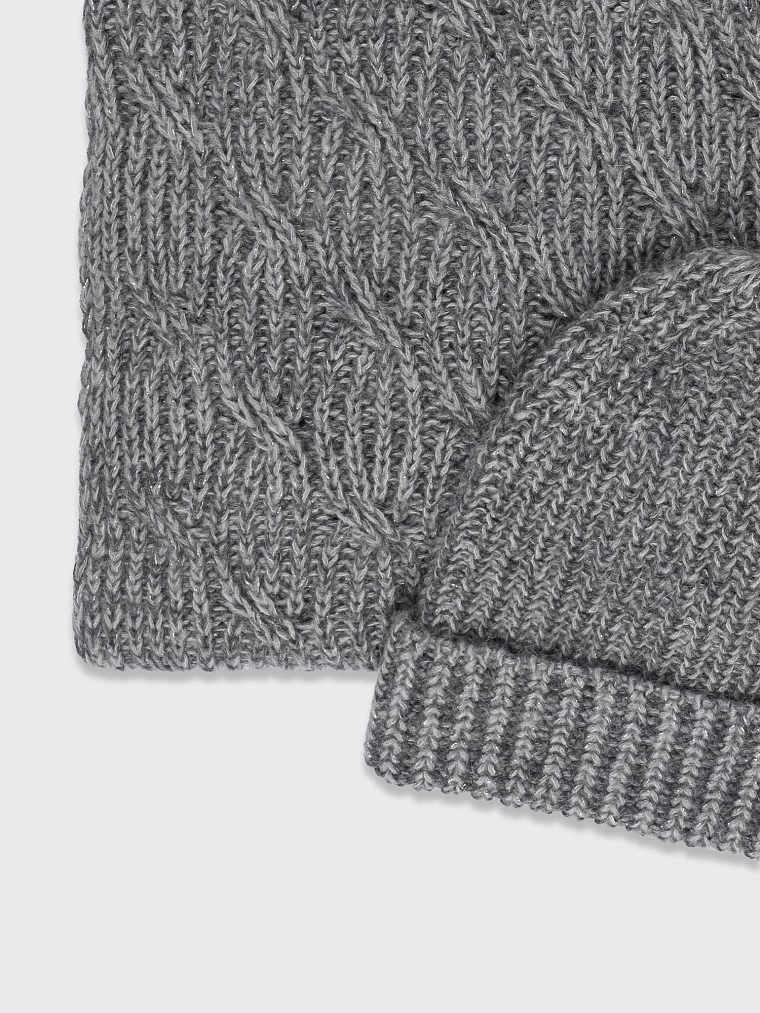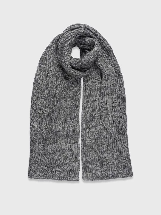 Пряжа с особым смесовым составом делает аксессуар практичным, ведь в составе мягкий и прочный акрил и пушистый, теплый мохер. Такой состав идеально сочетается с осенними и зимними пальто и пуховиками, а функциональный дизайн с отворотом позволяет дополнять шапкой из серого мраморного меланжа разные образы — от спортивных до элегантных.