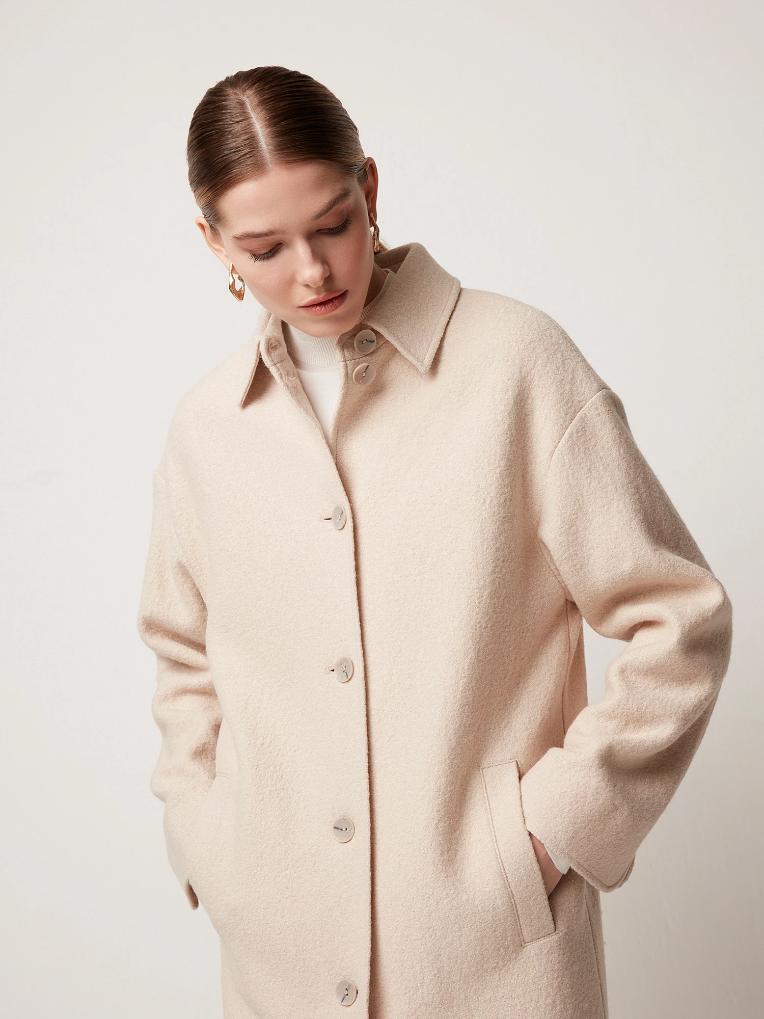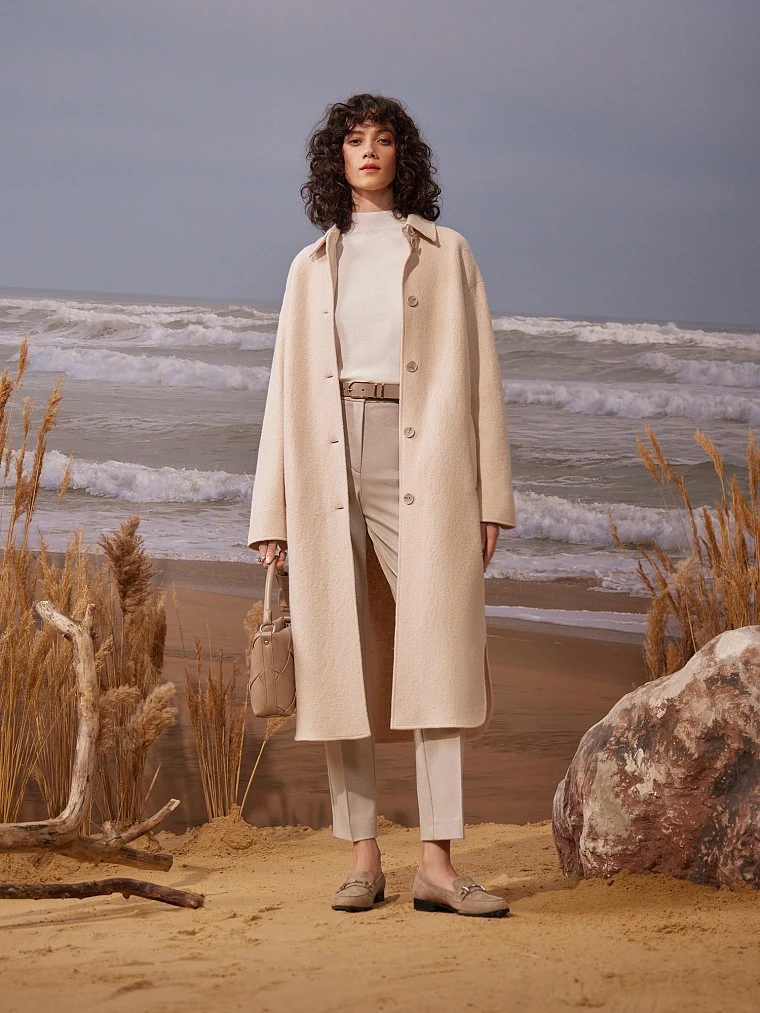Базовое пальто деликатного бежевого оттенка выполнено из текстурной смесовой шерсти премиального качества. Модель стильного прямого силуэта со стояче-отложным воротником, спущенной линией плеча, длинным втачным рукавом, центральной застёжкой на пуговицы в тон изделию и карманами с листочкой. Элегантное пальто идеально завершит как классический образ, так и лук в стиле смарт кэжуал.