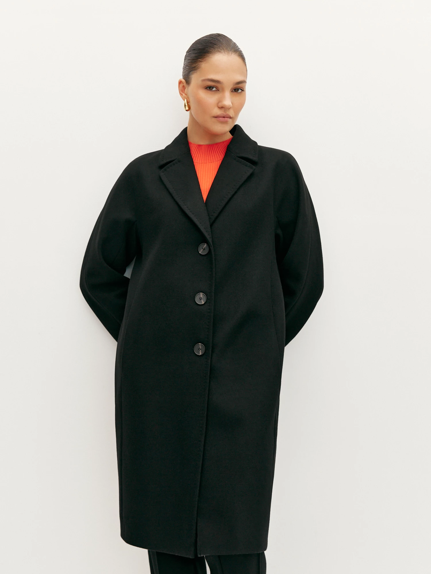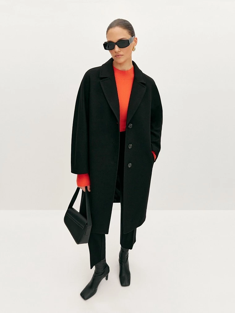 Однобортное пальто базового чёрного цвета. Тёплый полушерстяной материал отлично согреет в холодную погоду и защитит от дождя благодаря добавлению полиэстера. Лёгкая и комфортная подкладка на основе вискозы обеспечивает дополнительный комфорт. Прямой крой и длинный рукав со спущенным плечом обеспечивают комфорт, а отложной воротник с лацканами подчеркивает элегантный и стильный дизайн. Пальто прекрасно дополнит любой образ и станет верным спутником в холодное время года.
