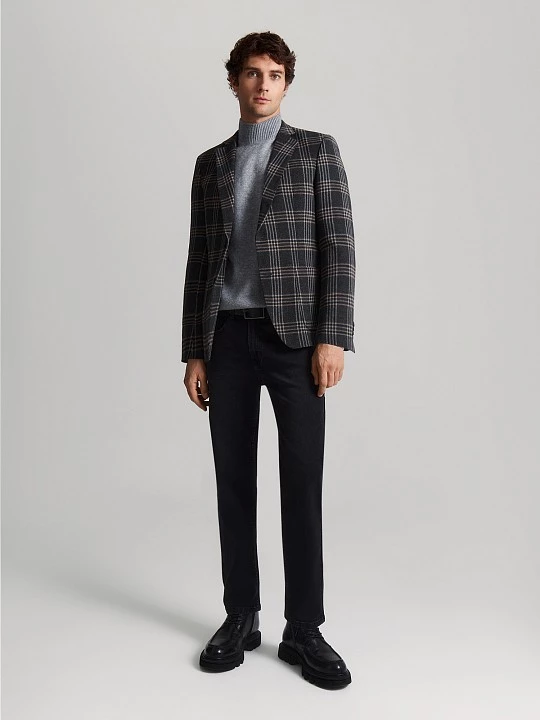 Однобортный, с классическим английским воротником, втачным рукавом и закругленными бортами - для пиджака в клетку выбран крой, не добавляющий объема. Боковые накладные карманы с закругленными краями лаконичны и повторяют форму бортов, нагрудный карман с листочкой также не перегружает образ. Клетчатый пиджак выполнен на полной подкладке и дополнен двумя внутренними карманами с фиксацией на пуговицу. Костюмная шерстяная ткань хорошо подходит для создания мужских пиджаков, она говорит о статусе и хорошем вкусе владельца. Серо-черный оттенок в бежево-коричневую клетку позволяет адаптировать модель в самые разные образы, пиджак можно надеть в праздничный день, на выпускной, в школу, в офис, под джинсы.