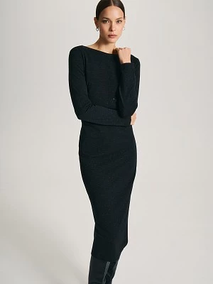 Платье длины миди привлекательного приталенного силуэта с эффектной драпировкой по боковому шву и деликатной горловиной «лодочка» подойдет и на каждый день, и для особого случая. Модель выполнена с застежкой на потайную молнию по боковому шву и длинными комфортными рукавами. Для платья использован хлопковый кроеный трикотаж. Хлопок гигроскопичен (хорошо впитывает воду) и пропускает воздух. Вплетенная нить люрекса медного оттенка обеспечивает деликатное мерцание в лучах света. Платье в классическом черном хорошо впишется в гардероб и будет востребовано как повседневное, офисное, школьное, вечернее, нарядное, новогоднее.