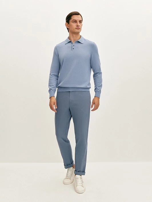 Вязаное поло голубого оттенка полуприлегающего силуэта, с отложным воротником с застёжкой на пуговицы и длинным рукавом с манжетами. Модель выполнена в тонкой гладкой вязке из натурального хлопка. Это мягкий, прочный, приятный на ощупь материал, который при правильном уходе отлично сохраняет превосходный внешний вид. Лаконичное базовое поло прекрасно дополнит гардероб и станет удачным вариантом на каждый день.