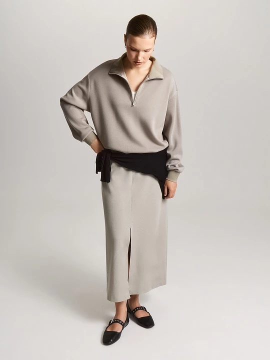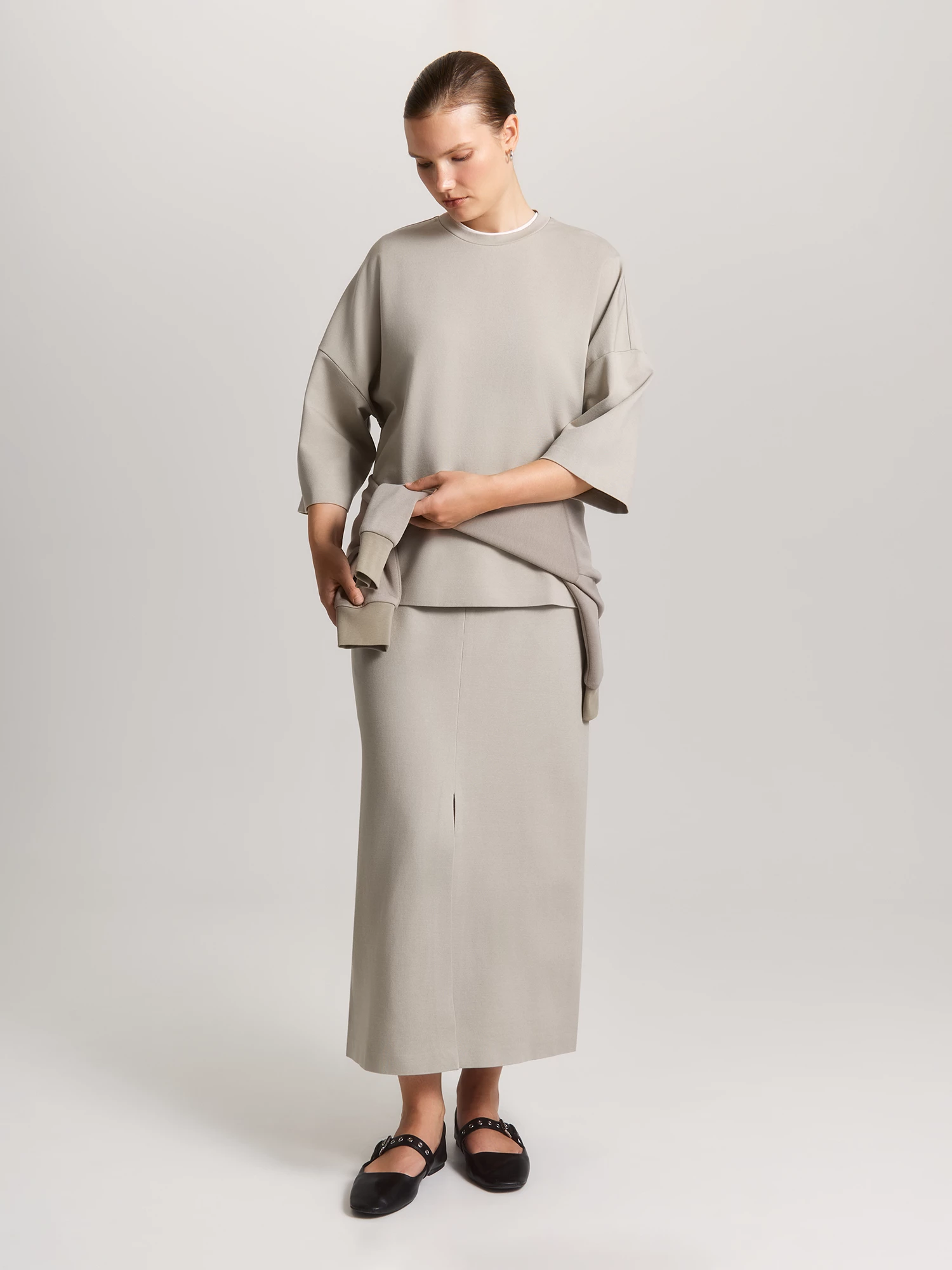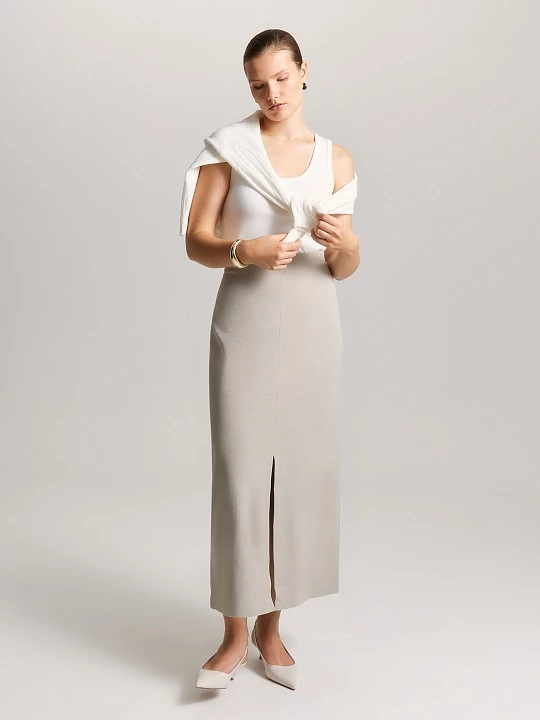 Прямая юбка с разрезами в оттенке "камень" сочетает в себе элегантность и повседневный комфорт. Отсутствие притачного пояса обеспечивает комфортную посадку, мягко облегая фигуру без сдавливания, а потайная молния сбоку сохраняет чистоту линий. Главная особенность юбки – стильные расходящиеся разрезы спереди и сзади, которые добавляют динамику классическому силуэту.