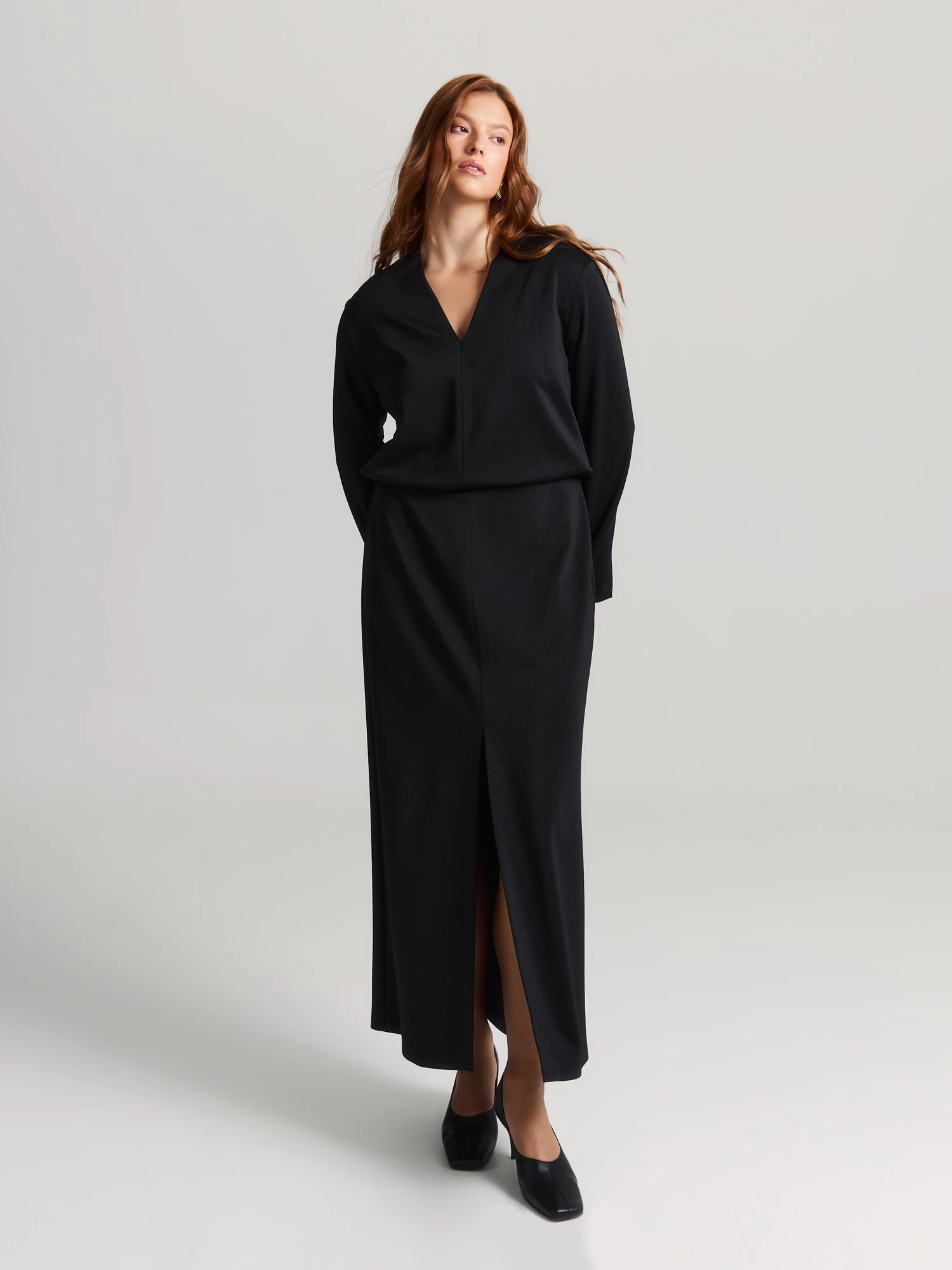 Рельефный шов спереди переходит в элегантный разрез, который визуально вытягивает силуэт.