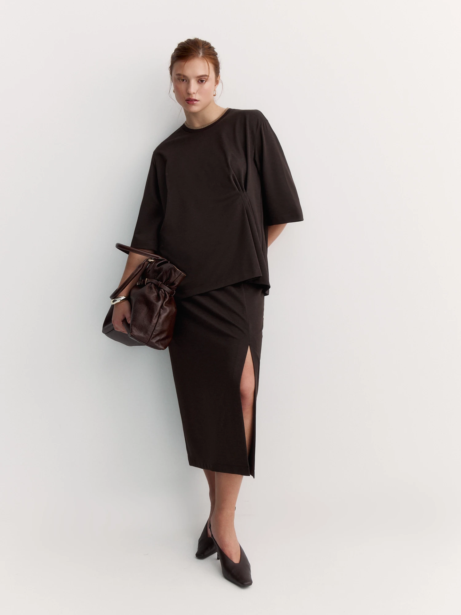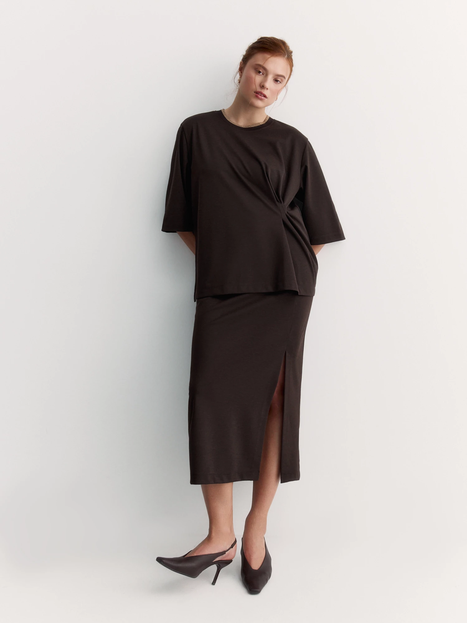 Юбка из трикотажа с добавлением шелковистой вискозы тактильно приятна и обеспечивает выгодную посадку. Фактура «пике» и меланжевый шоколадный оттенок придают модели особенную текстуру, а прямой крой и разрез по ноге - стройнят силуэт.