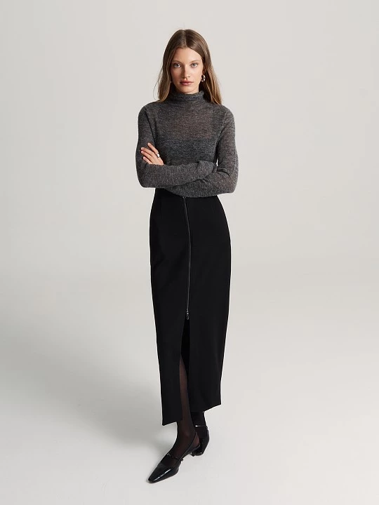 Прямая юбка без подкладки примечательна вшитой длинной вертикальной молнией, которая заканчивается там, где начинается эффектный разрез, вытягивающий силуэт.