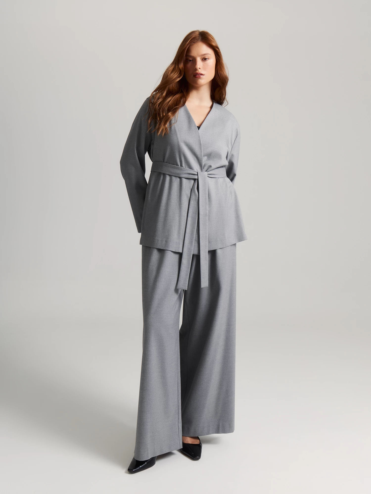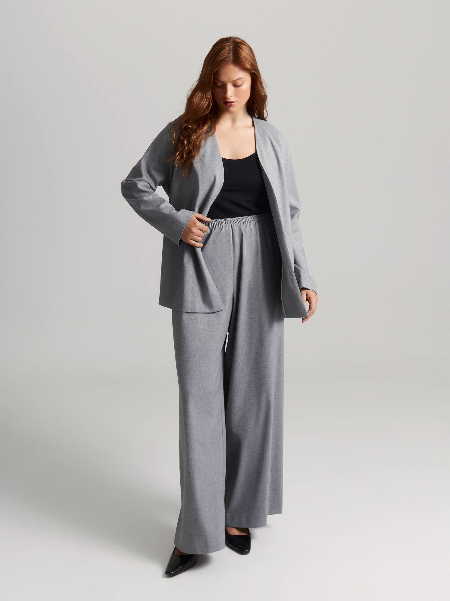 Спокойный серый меланж брюк легко сочетается с блузой BL1693, лонгсливами и джемперами коллекции.