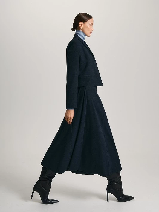 Выбрали для юбки расклешенный силуэт, выполненный с помощью шести клиньев и прекрасно подходящий к короткому жакету JC0178 из ткани с тем же составом. Модель потребовала достаточно лаконичного кроя, без притачного пояса, с застежкой сбоку на потайную молнию.