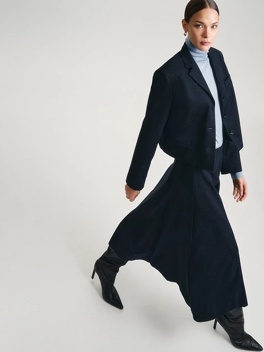 Строгий темно-синий меланж определяет модель как универсальную. Юбка будет востребована как повседневная, офисная, школьная, а также для образов особых случаев и в стиле кэжуал.