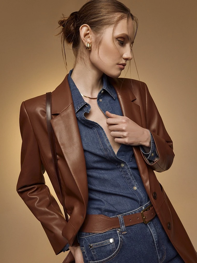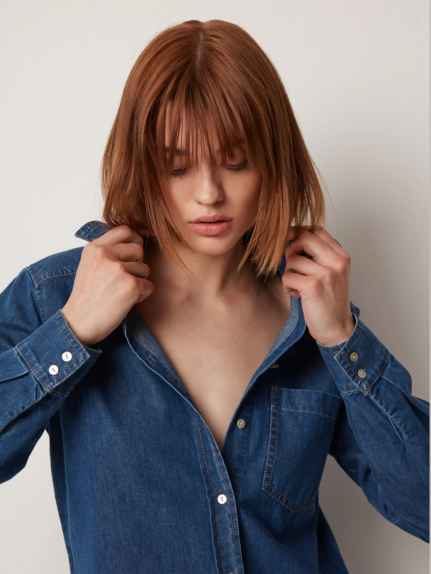 Рубашка из фирменного денима классического синего цвета. Декорирована накладным карманом на груди. Материал премиального качества из хлопка мягкий, прочный и устойчивый к износу. Модель полуприлегающего силуэта, с отложным воротником с отрезной стойкой, втачным рукавом с манжетой и центральной застёжкой на планку с пуговицами. Талиевые вытачки на спинке обеспечивают идеальную посадку по фигуре. Составит однотонный тотал-лук с джинсами из той же коллекции. Образ можно дополнить однобортным пиджаком из экокожи и высокими сапогами или кроссовками.