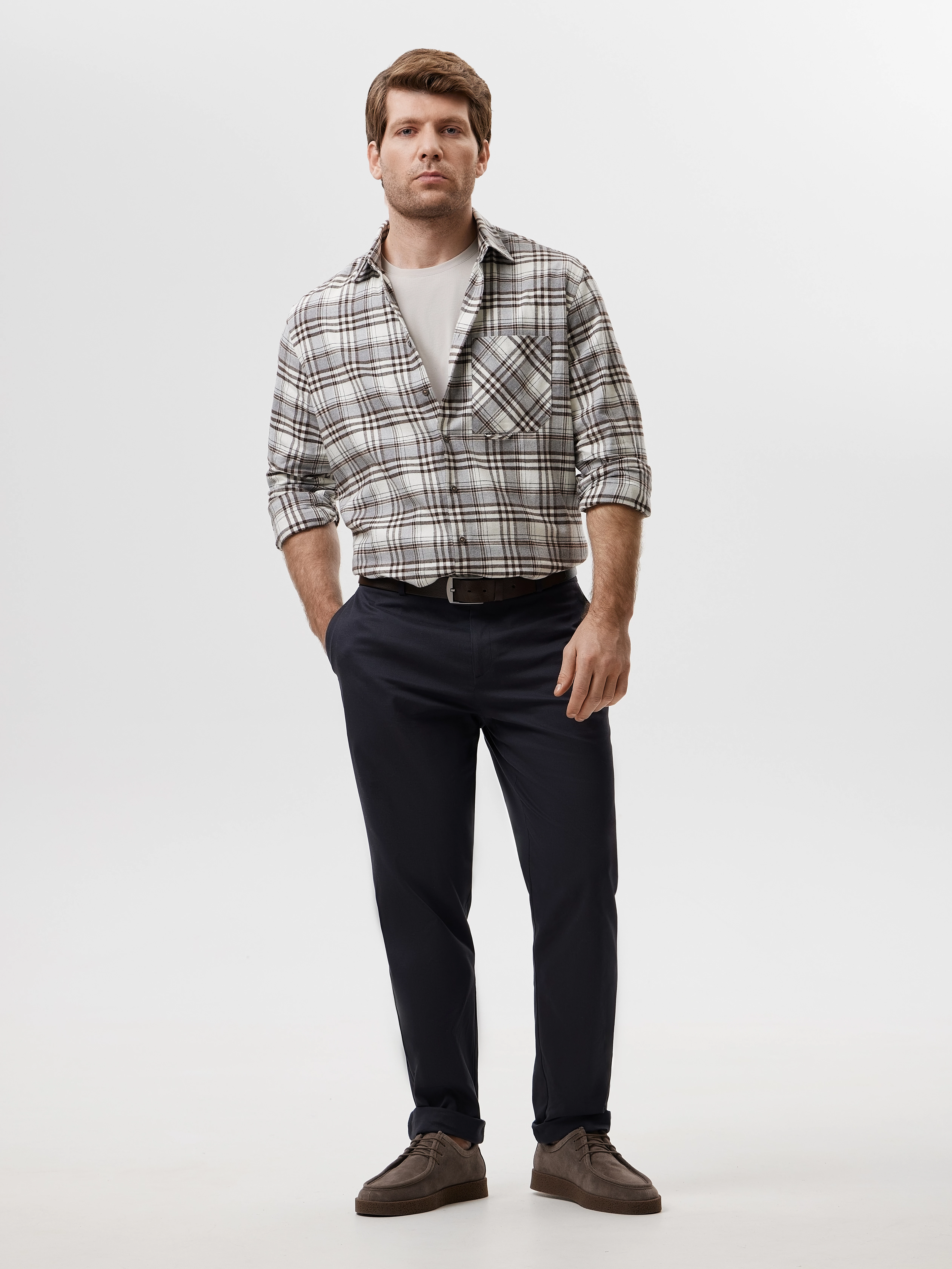 Рубашка в классическую светло-коричневую клетку выполнена из мягкой хлопчатобумажной фланели. Модель комфортного силуэта regular fit, с длинным рукавом, лаконичного кроя: отложной воротник на отрезной стойке, центральная застежка на пуговицы, закругленный низ. Узкая кокетка обеспечивает хорошую посадку по спине и плечам. Привлекает внимание нагрудный карман со скошенным углом и декоративной петлей. Хлопок гипоаллергенен, хорошо дышит, удобен в эксплуатации. Фланель при стирке не садится и не линяет, если температура воды не превышает рекомендованную. Теплая сорочка будет востребована как неформальная офисная, школьная, повседневная. Наши дизайнеры рекомендуют носить ее в паре с футболкой или водолазкой, чтобы создать модную многослойность.