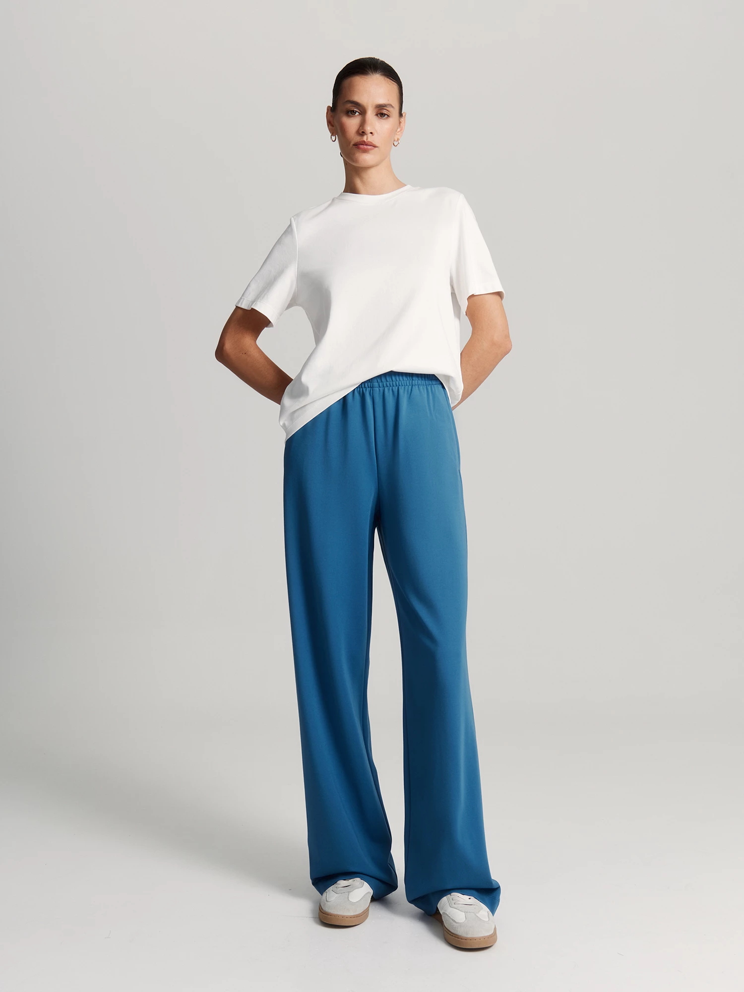 Брюки из вискозного трикотажа – мягкие, уютные и отлично тянутся, чтобы двигаться было комфортно. Синий цвет "глубокая вода" привлекает внимание и делает модель акцентом образа.