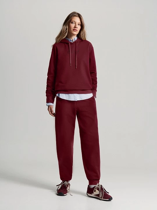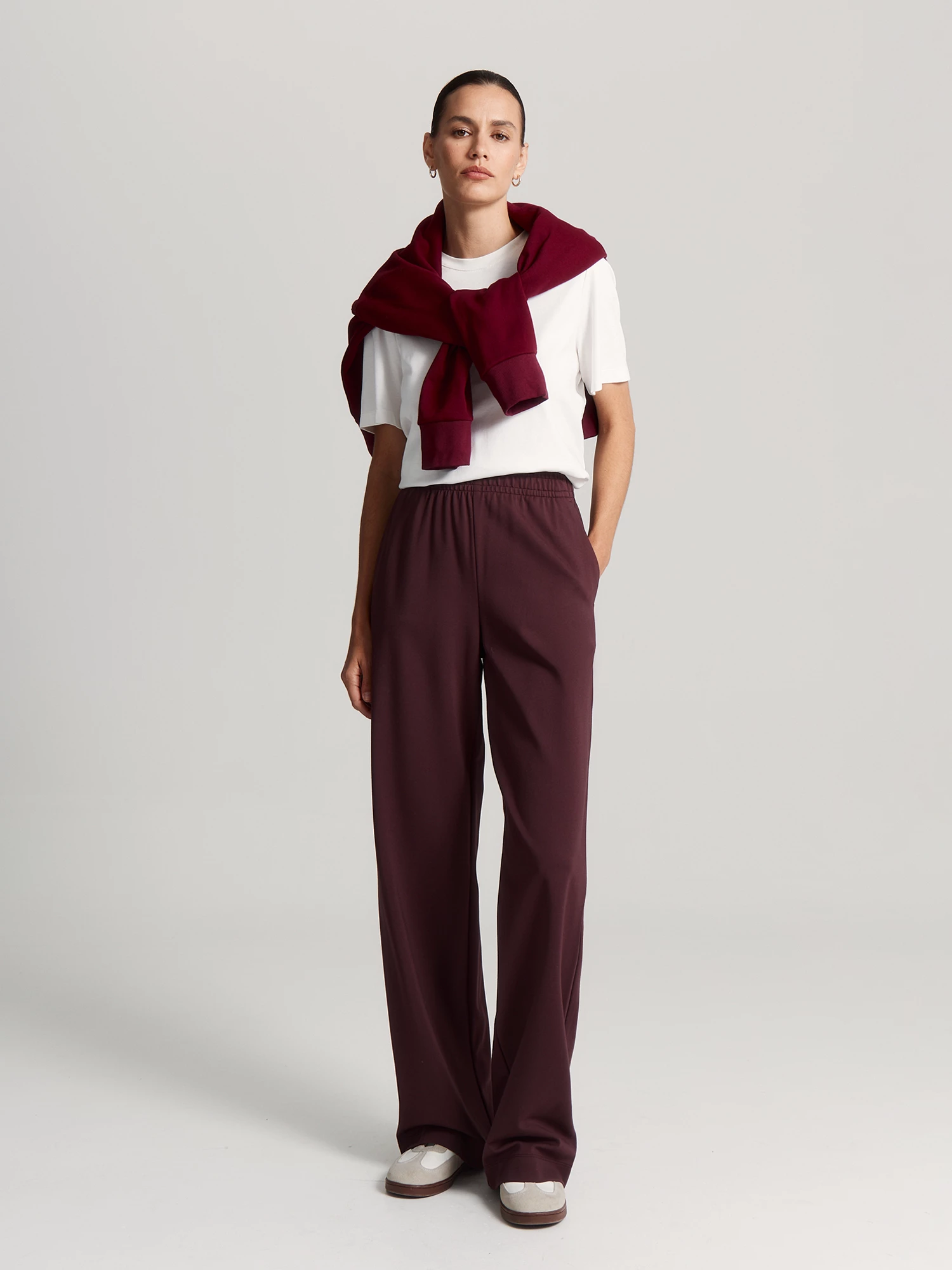Брюки из вискозного трикотажа – мягкие, уютные и отлично тянутся, чтобы двигаться было комфортно. Цвет "коричневый камень" с бордовым подтоном универсален и может заменить в образе черный или синий низ.