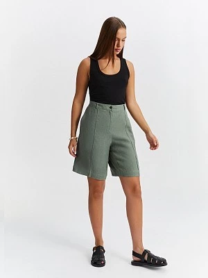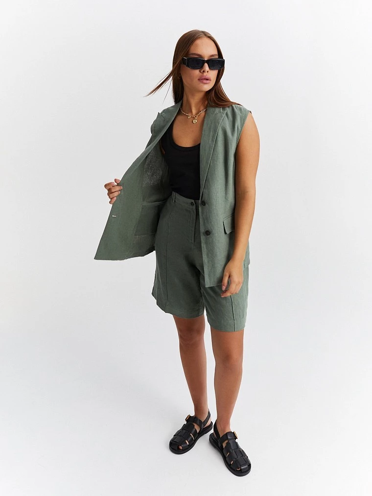 Шорты - бермуды станут незаменимой вещью летнего гардероба. Модель выполнена из тончайшего льна, который почти не ощущается на теле и хорошо пропускает воздух. Застежка на молнию и резинка на поясе обеспечивают удобную посадку на любой тип фигуры, а отрезные карманы добавляют удобства. Вертикальные стрелки вытягивают силуэт и придают шортам классический вид. Рекомендуем комбинировать с футболками или топами из коллекции, и дополнить льняным жилетом из капсулы.