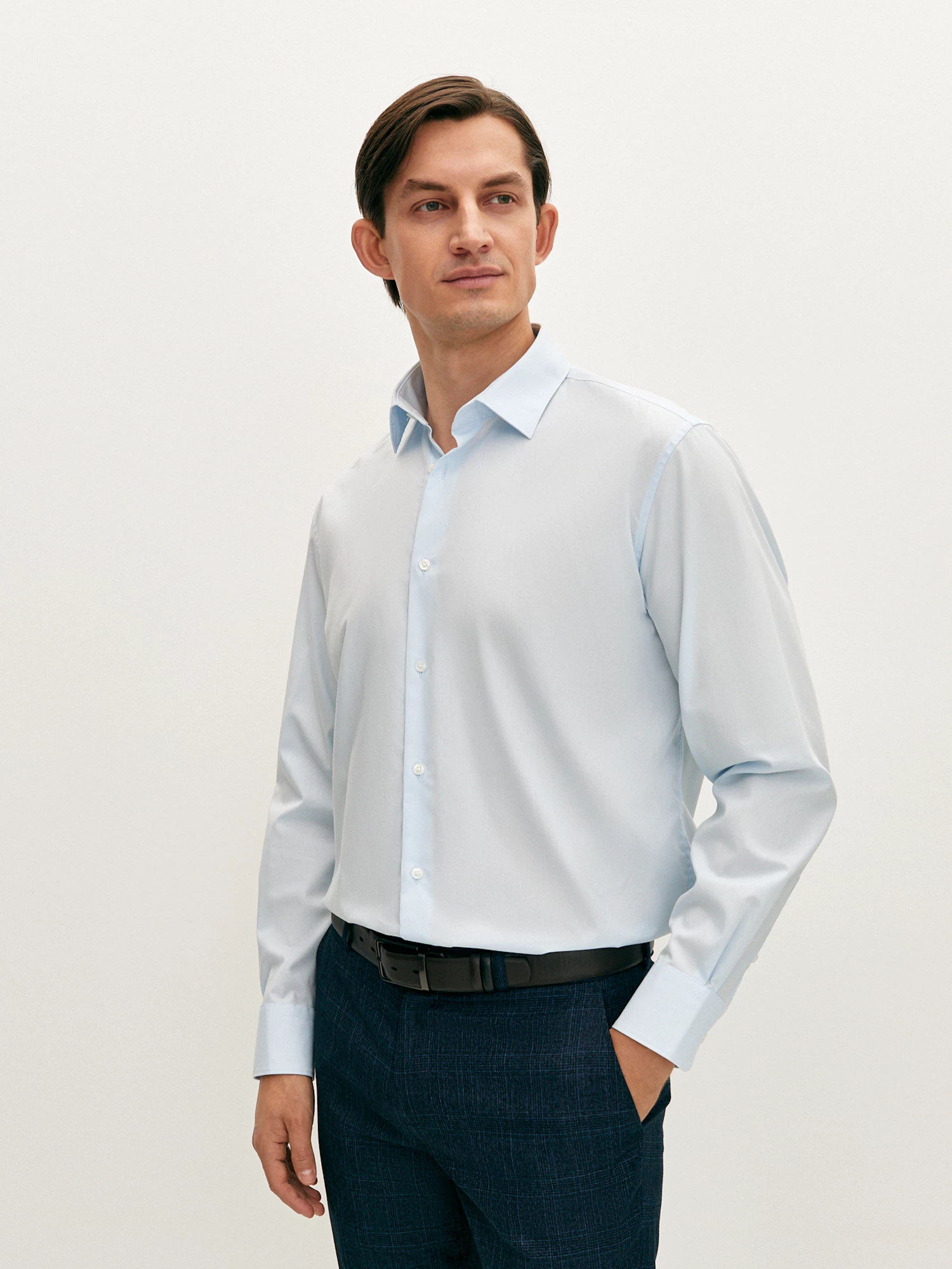 Классическая голубая сорочка свободного прямого силуэта без вытачек. Модель выполнена из гладкого дышащего хлопка, а выверенный крой обеспечивает удобную посадку по фигуре. Модель без карманов с классическим воротником. К такому типу воротника подойдет галстук, завязанный классическим или широким узлом. Базовая сорочка никогда не выйдет из моды, и гармонично впишется в лаконичный офисный образ.
