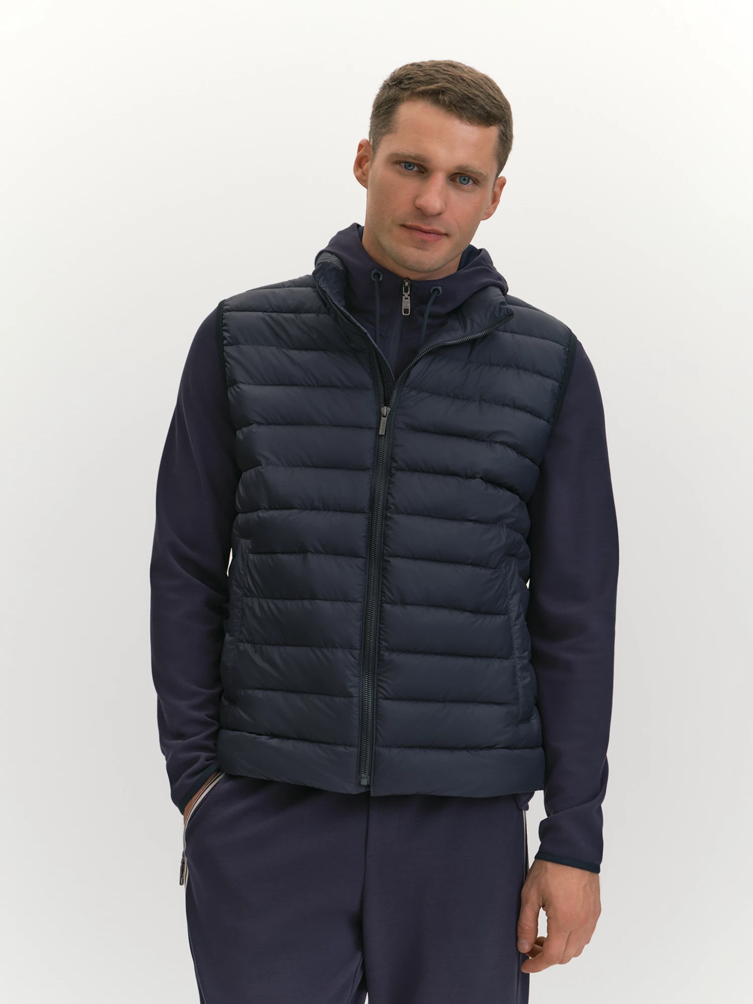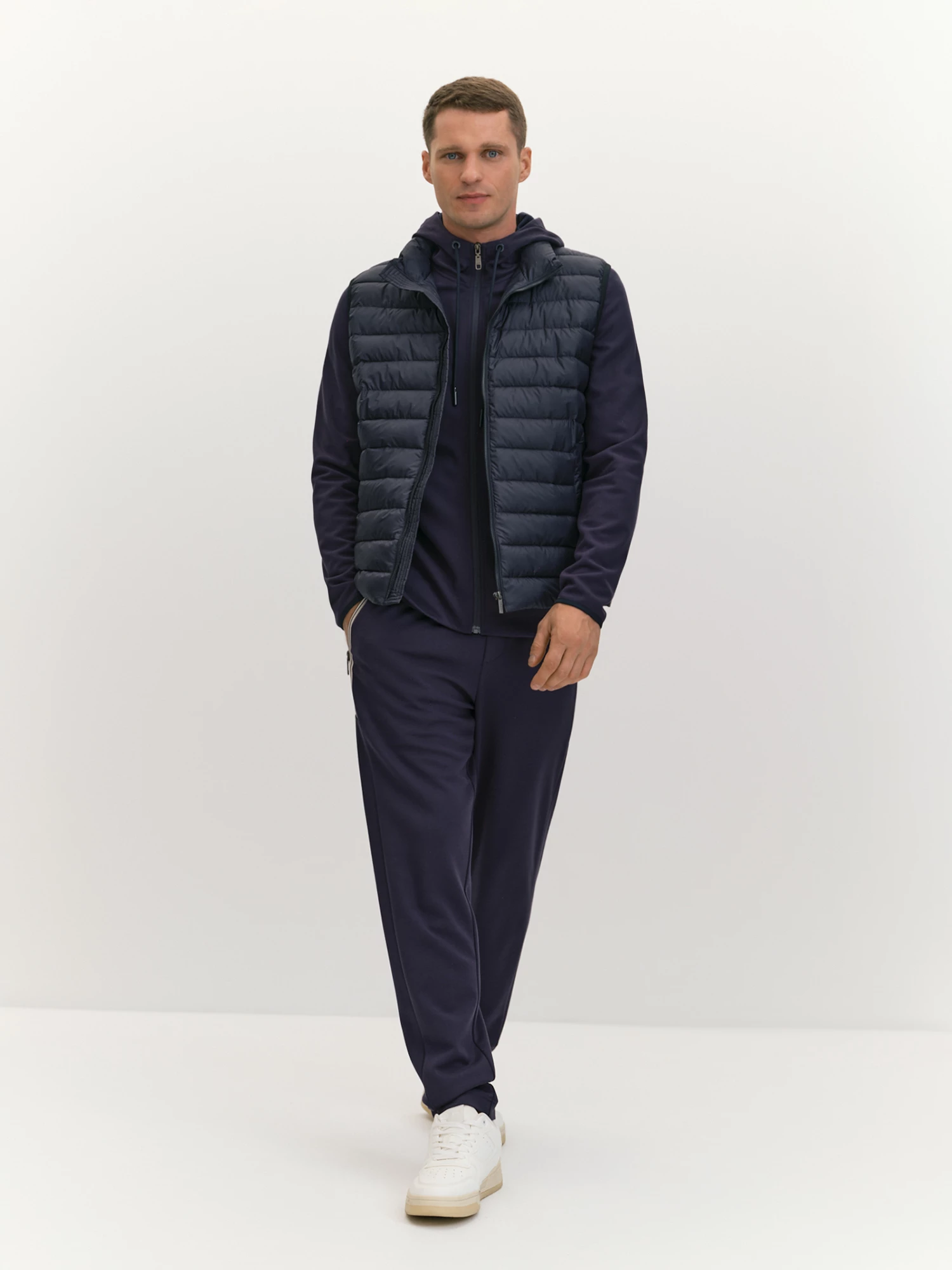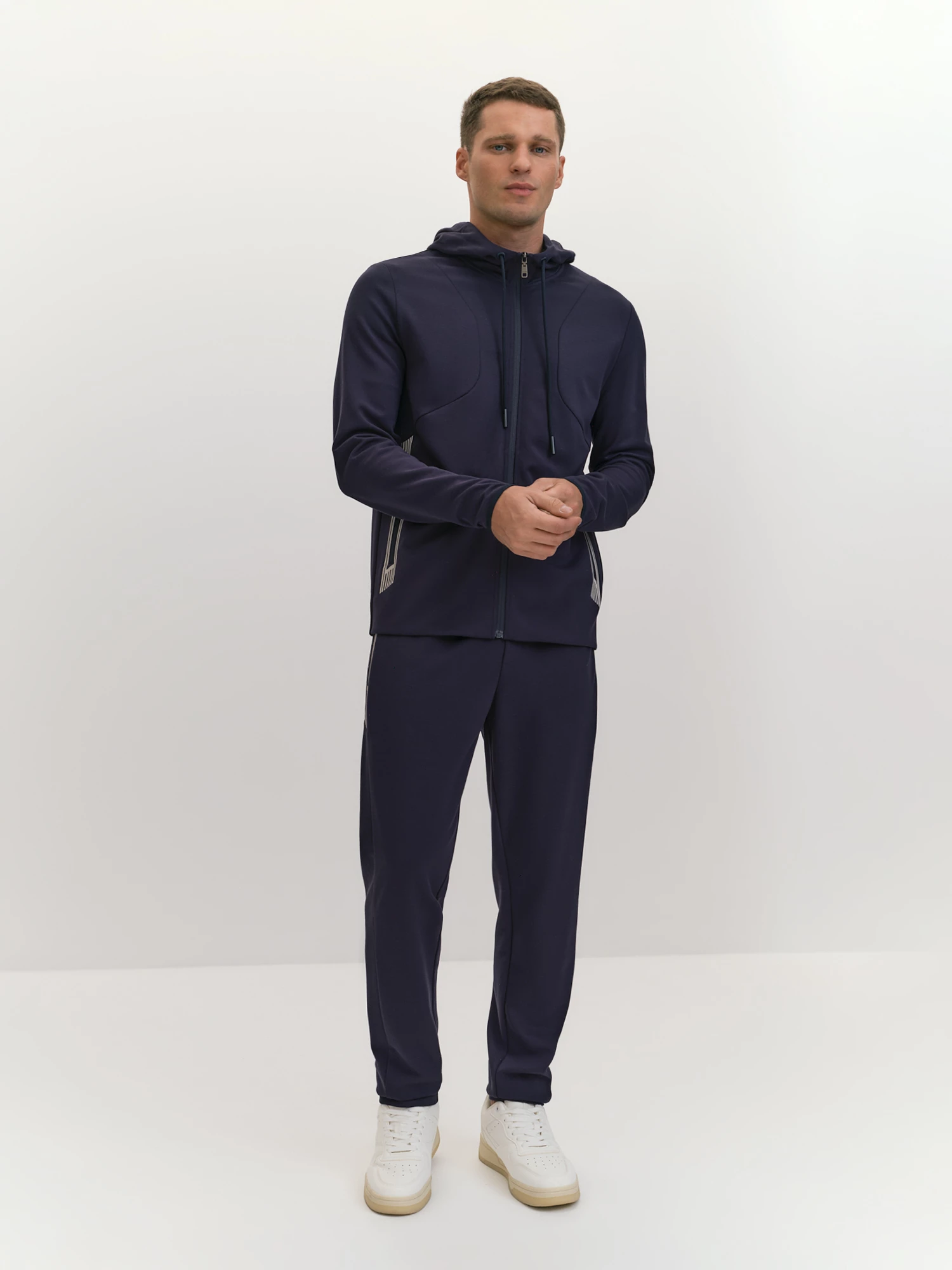 Брюки силуэта slim с притачным поясом на резинке. Прилегание пояса можно регулировать шнуром, декорированным лаконичными эглетами в тон основной ткани. Особые фигурные швы способствуют лучшей посадке. Специальный принт, декорирующий боковые карманы на молнии и выполненный с помощью современной технологии печати по ткани на нашем собственном производстве, логично завершает дизайн изделия. Особый комфорт брюкам придает качественный вискозный трикотаж, он воздухопроницаем, долговечен и хорошо держит форму. Глубокий, контрастный и строгий темно-синий цвет брюк хорошо сочетается со светлыми и такими же насыщенными темными оттенками. Отличный вариант и для прохладной, и для теплой весны, прогулок, спорта, выходных дней.