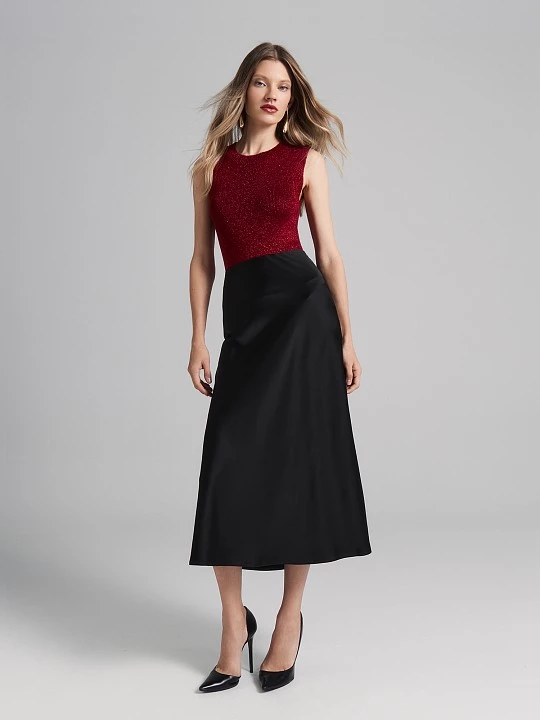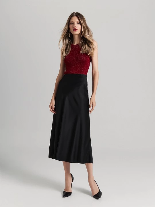 Топ прилегающего силуэта идеально работает во множестве образов. Связанный из особой пряжи с металлизированным блеском, он выполняет функции и базы, и акцента гардероба.
