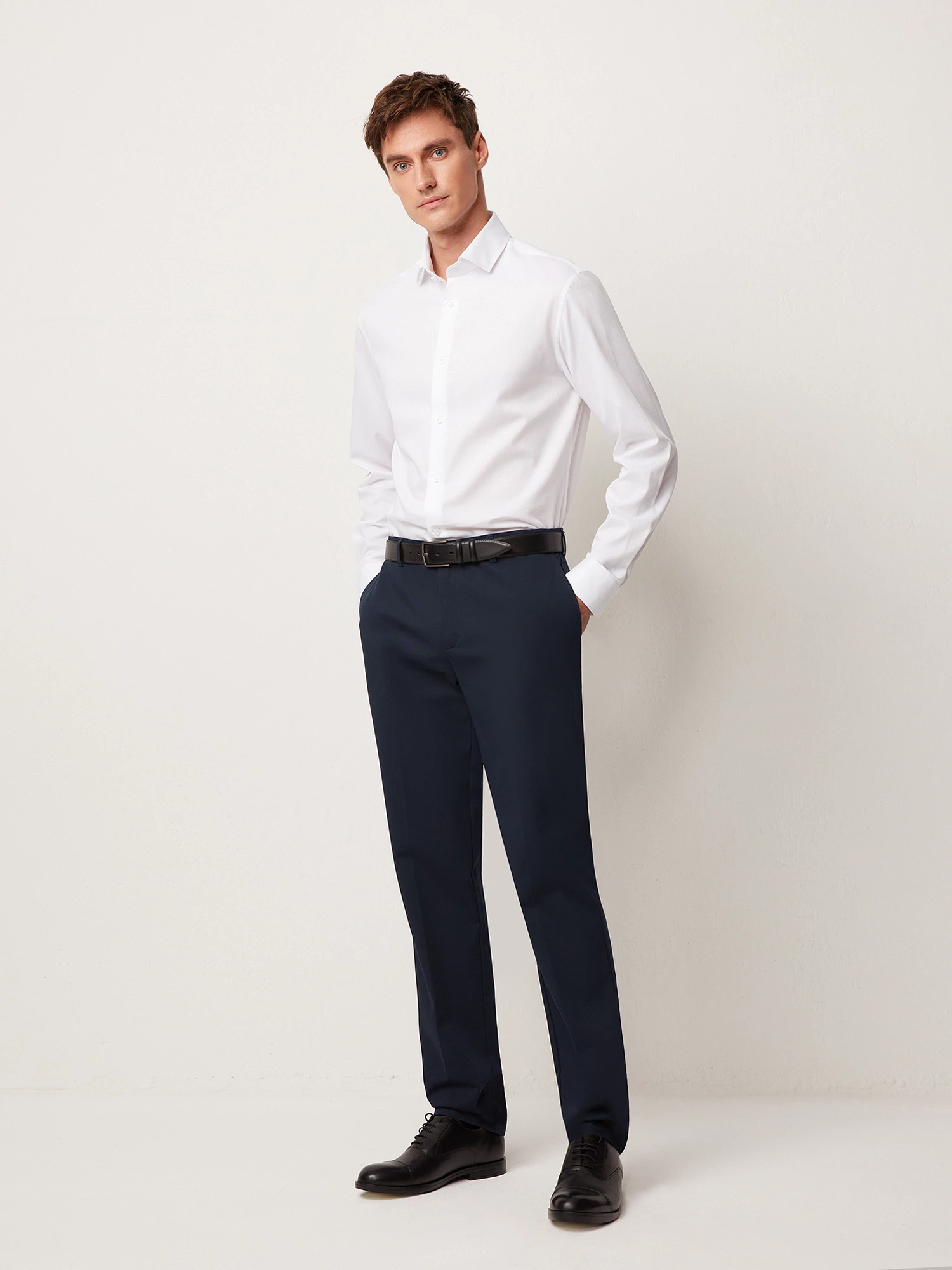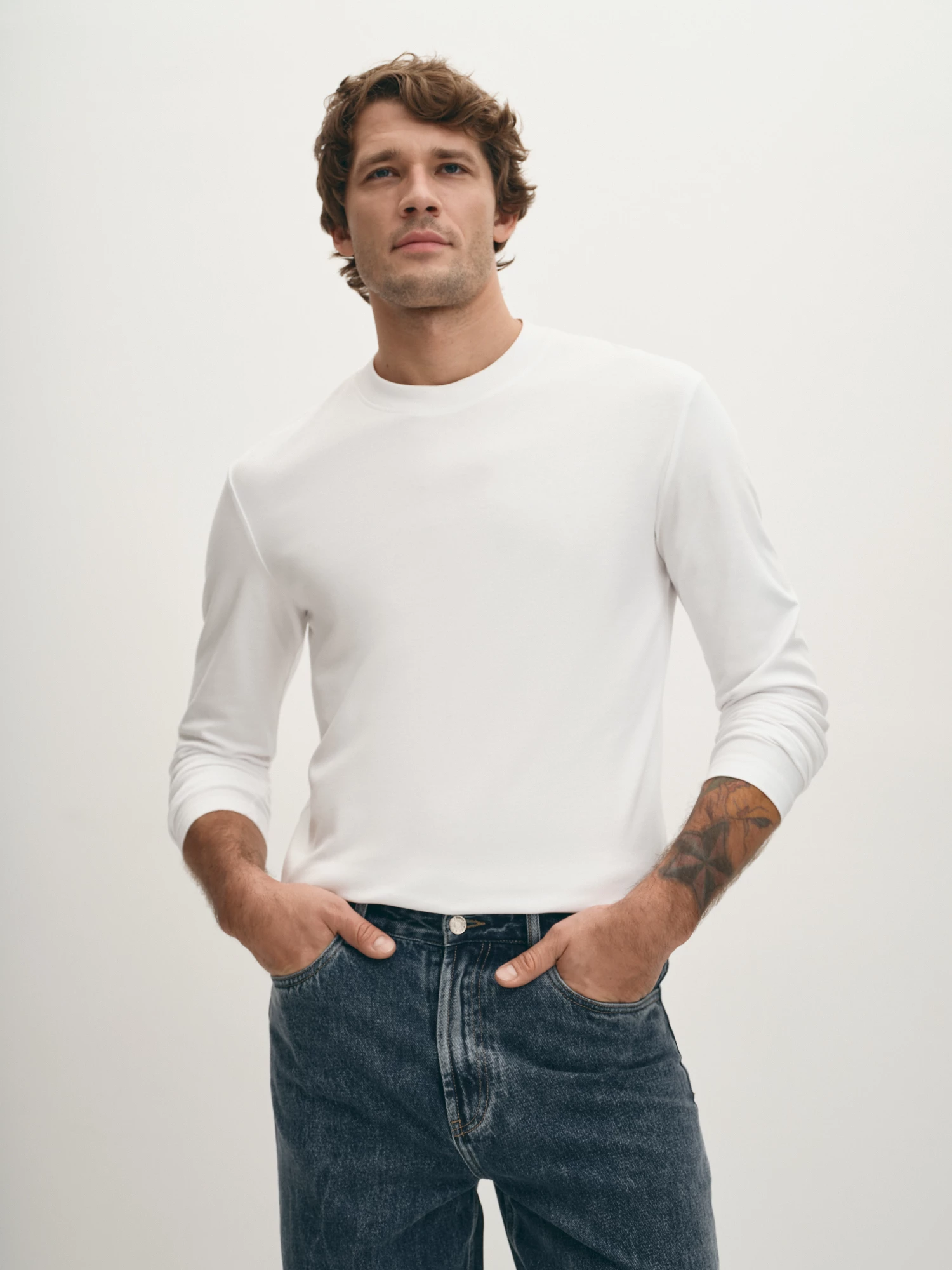 Под свитшот можно надеть футболку с круглым вырезом из коллекции или повседневную рубашку, не выправляя воротник. В качестве первого слоя такую модель носят под неформальный пиджак, добавив к образу спортивную обувь.