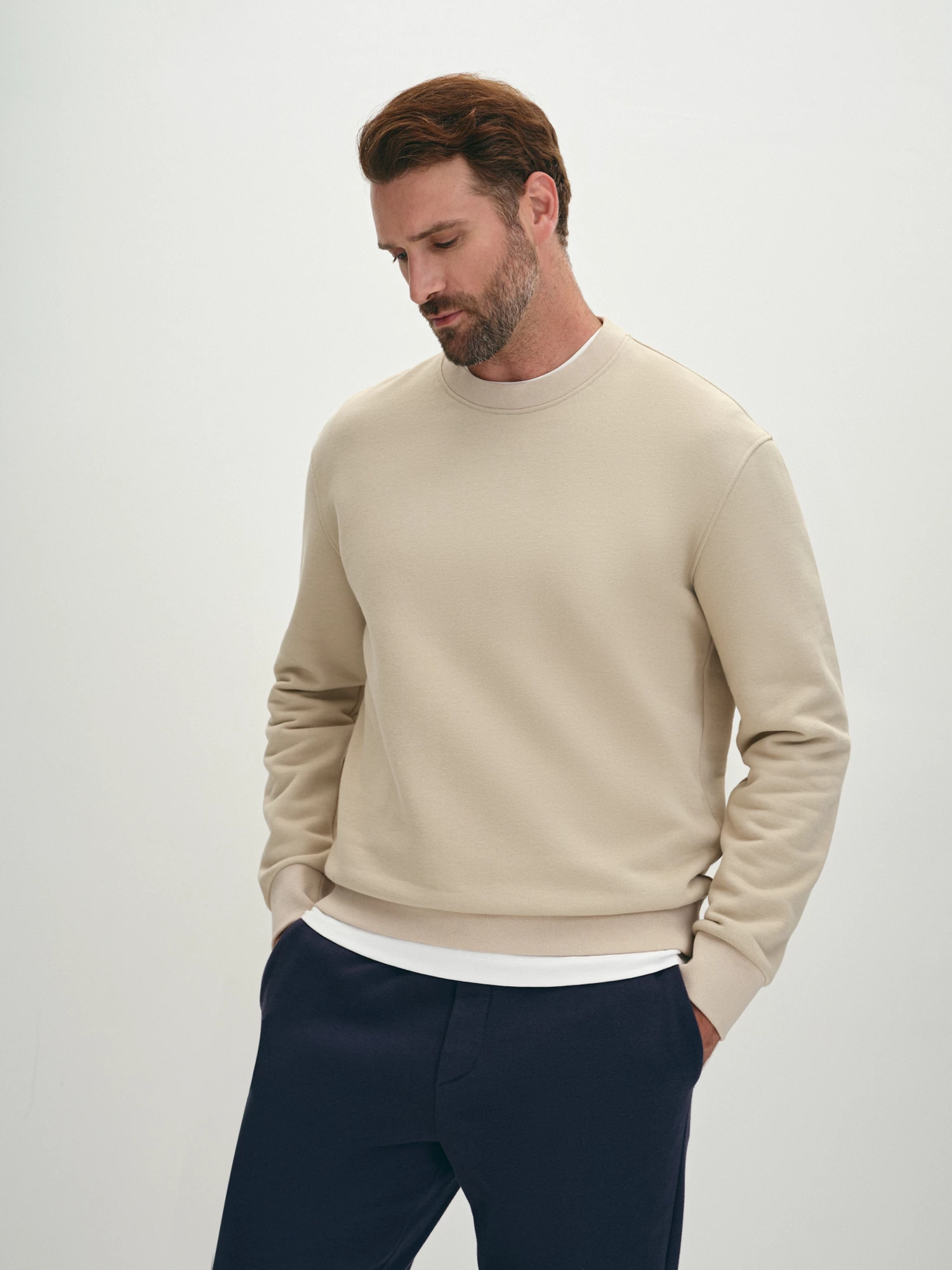 Джемпер выполнен из плотного хлопкового трикотажа песочного цвета. Такое полотно характеризуется тактильно приятным начесом с изнаночной стороны. Свитшот отличается аккуратным круглым вырезом, эластичными манжетами и резинкой по низу изделия. Обтачка горловины, манжеты и низ изделия выполнены из трикотажа "рибана", внешне напоминающего вязаную резинку. Рибана известна хорошей плотностью и эластичностью.