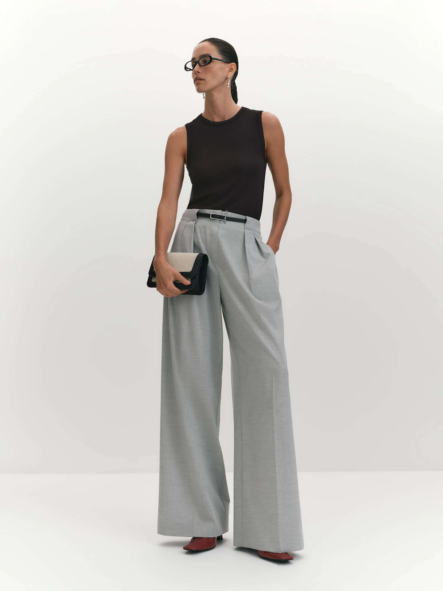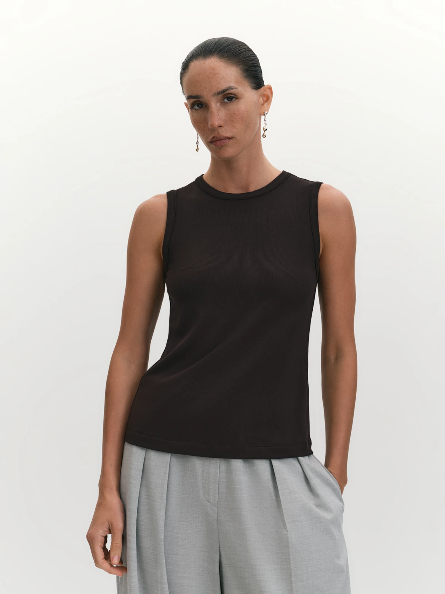 Базовый и минималистичный топ представляет собой лаконичный и универсальный элемент гардероба, который подходит для различных ситуаций и образов. Его простой, но изысканный дизайн подчеркивается отделкой выреза горловины и проймы окантовкой из основной ткани, что обращает внимание на высокое качество пошива. Ткань топа — вискозный трикотаж "рибана" с добавлением спандекса — обладает мягкостью, легкостью и высоким тактильным качеством. Вискоза делает топ воздухопроницаемым, что особенно комфортно в теплое время года, а cпандекс придает ткани эластичность, обеспечивая хорошую посадку по фигуре и свободу движений. Трикотаж "рибана" отличается высокой формоустойчивостью, что делает топ удобным и практичным. Черный цвет придает топу универсальность, позволяя использовать его как в повседневной, так и в более официальной обстановке. Прилегающий крой мягко подчеркивает фигуру, создавая аккуратный и женственный силуэт, при этом обеспечивая комфорт и свободу движений благодаря эластичности ткани. Такой топ незаменим в базовом гардеробе.