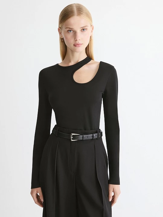 Облегающий лонгслив с длинным втачным рукавом - хорошая осенняя альтернатива топу и футболке. С модным овальным вырезом через плечо в дополнение к круглой горловине, модель выглядит актуально и лаконично.