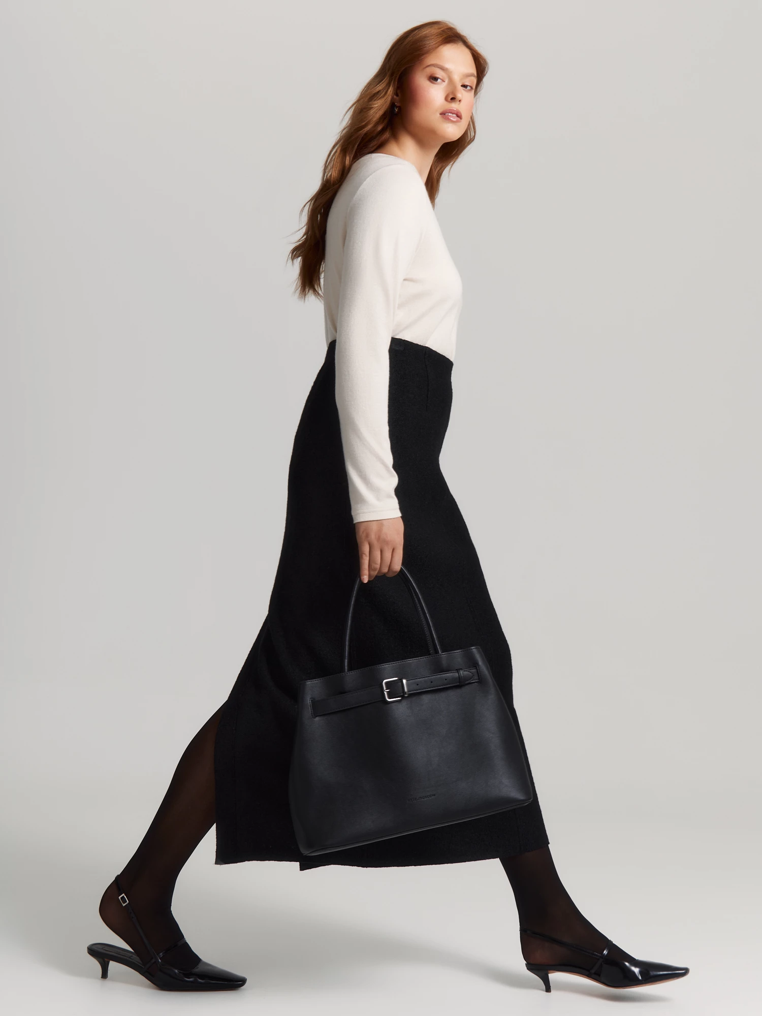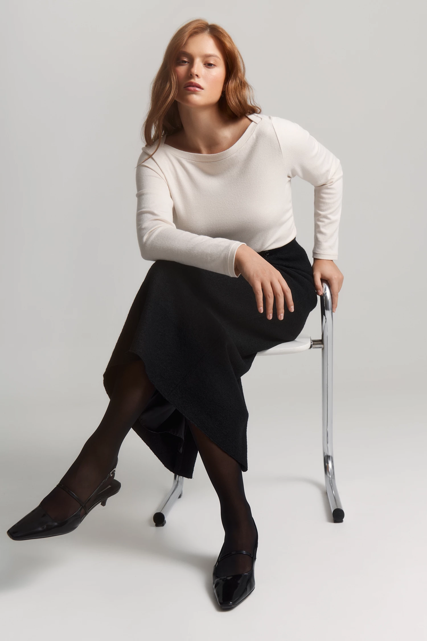 Элегантный вырез-лодочка и длинный рукав со спущенным плечом создают мягкий, женственный силуэт. Легкая сборка по боковым швам на уровне талии делает модель еще выразительнее.