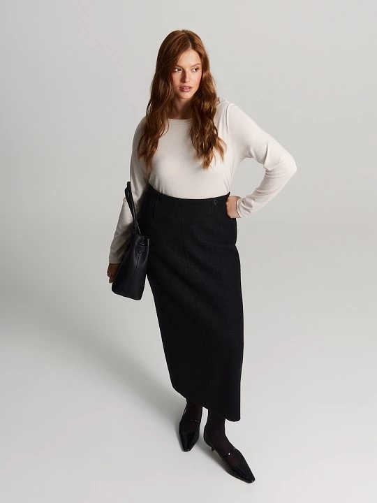 Блуза полуприлегающего силуэта выполнена из смесового трикотажа с особой фактурой. Такая ткань отличается хорошей устойчивость к пиллингу. Полотно со сложным составом тактильно приятно благодаря вискозе и содержит согревающую овечью шерсть.