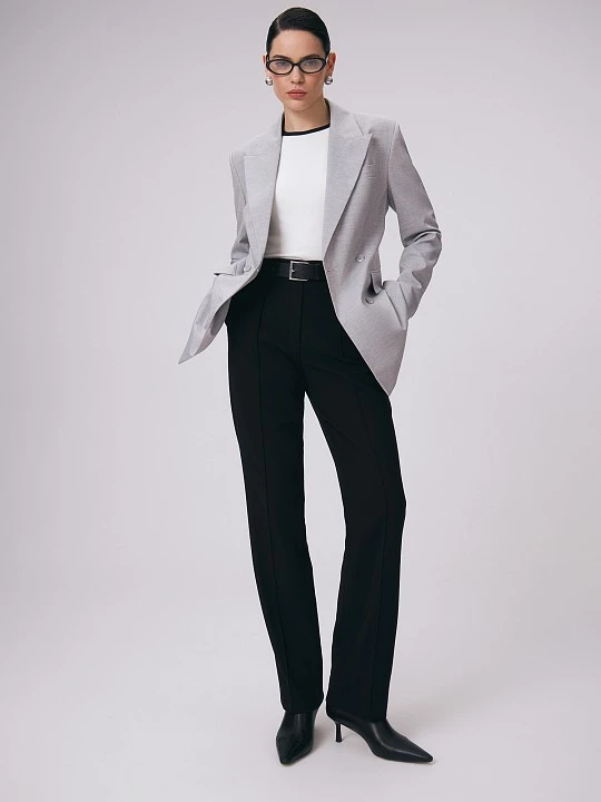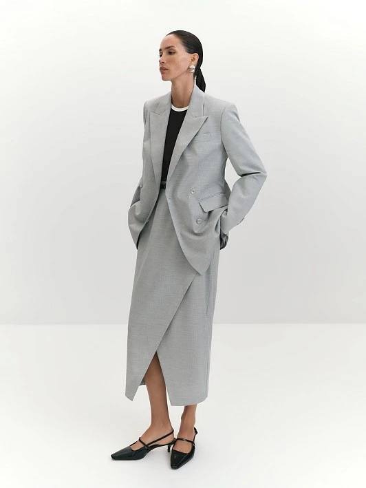 Создали жакет двубортным, с акцентом на плечах и широкими лацканами, увеличивающими возможности для стилизации. Благодаря акцентам в мужском стиле - прорезным карманам с клапанами, нагрудному карману с листочкой и декоративным шлицам на рукавах - модель на контрасте выглядит невероятно женственно. Особое внимание на плечи и карманы делает талию тоньше, а фигурный английский воротник обрамляет притягательный V-образный вырез. Высокотехнологичная меланжевая ткань из шерсти и вискозы отлично подходит для костюмной группы, она тактильно приятна, хорошо пропускает воздух, обладает хорошей терморегуляцией и устойчива к износу. Меланжевые ткани всегда имеют базовый цвет, к которому подбираются нити других оттенков, близких к основному. В итоге получается интересный эффект, называемый оптикой меланжа. Такое полотно экологично, ведь при его производстве используется меньше воды и энергии, чем при традиционных методах окрашивания. Серый меланж в образах хорошо сочетается с моделями в базовых и классических оттенках.