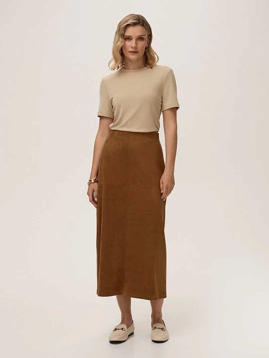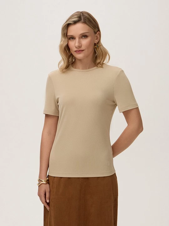 Выбрали для футболки качественный трикотаж на основе модифицированной вискозы. Такое полотно отличается высоким тактильным качеством, прочностью и эластичностью. Модифицированная вискоза, или модал добавит полотну мягкости и шелковистости, кроме того, модал прочнее вискозы. Футболка полуприлегающего силуэта выполнена с круглым вырезом с отделкой из основной ткани и коротким втачным рукавом. Модель декорирована небольшой вышивкой, выполненной на собственной фабрике на японской вышивальной машине Tajima. Теплой осенью универсальная футболка в базовом серо-бежевом нужна как самостоятельный верх, а зимой - как первый слой.