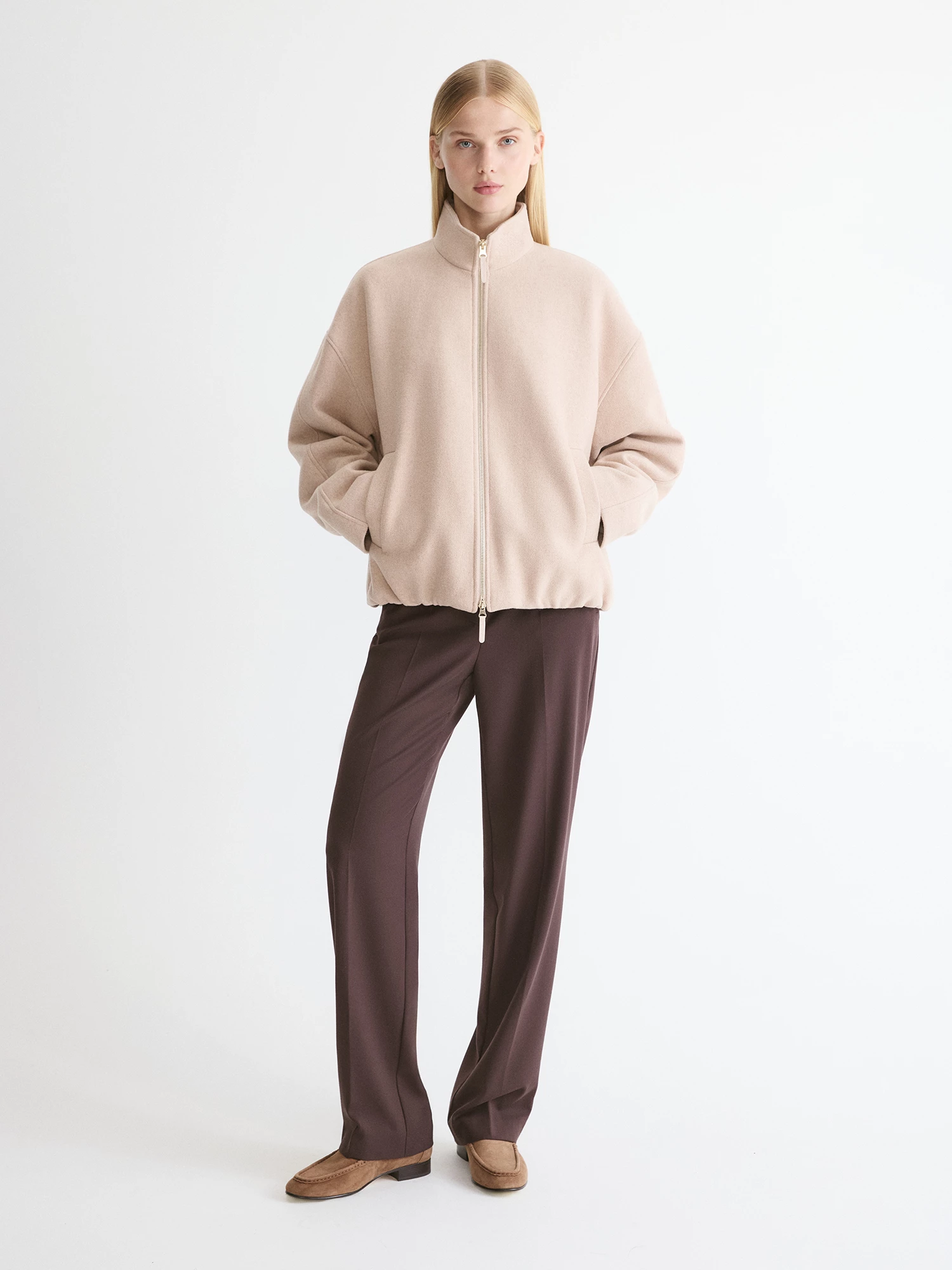 Стильная куртка на надежной двухзамковой молнии по функционалу напоминает пальто или тонкий пуховик. Модель из светло-бежевой шерстяной ткани с поливискозной подкладкой и и утеплителем из синтепона хорошо сохраняет тепло. Такое полотно хорошо подходит для создания моделей свободного стиля.
