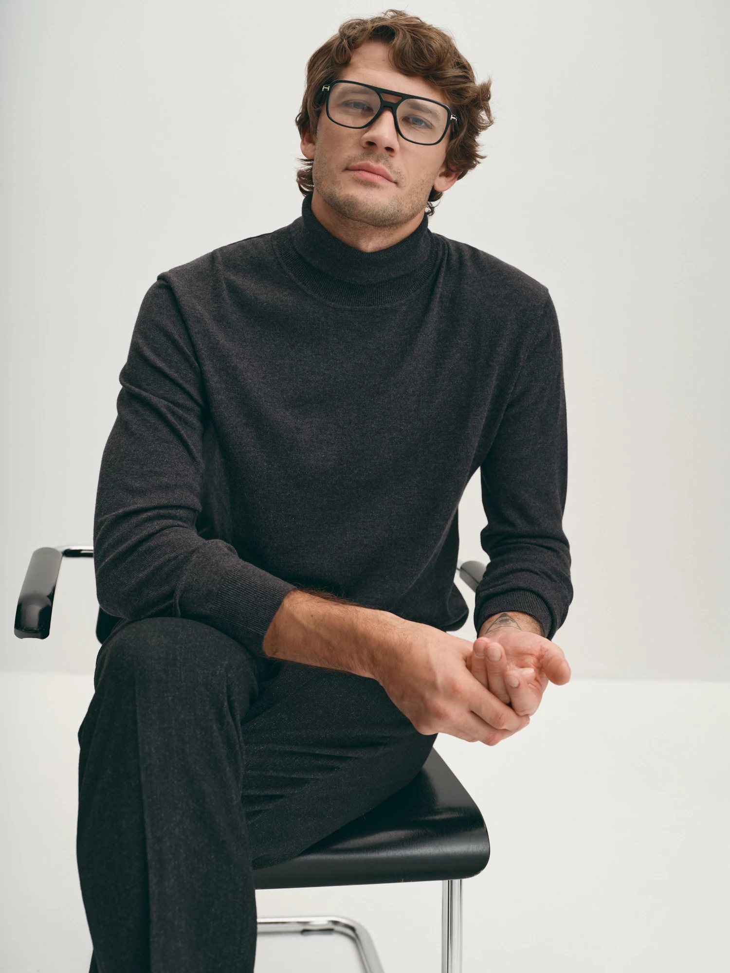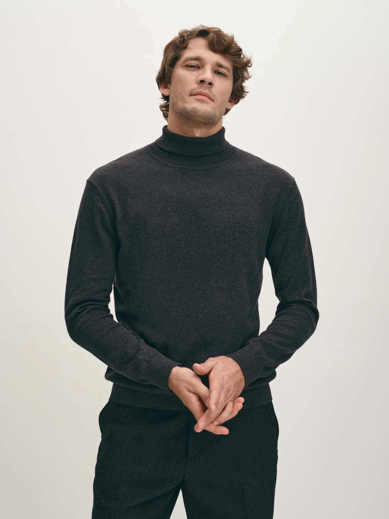 Удобная вязаная водолазка практичного графитового оттенка. Выполнена из фирменной пряжи на основе хлопка с добавлением шерсти мериноса. Модель прямого силуэта, с воротником-стойкой с отворотом и длинным втачным рукавом. Манжеты на рукавах, воротник и манжета внизу изделия оформлены подвязом. Водолазка в стиле смарт-кэжуал станет альтернативой привычным свитерам и лонгсливам.