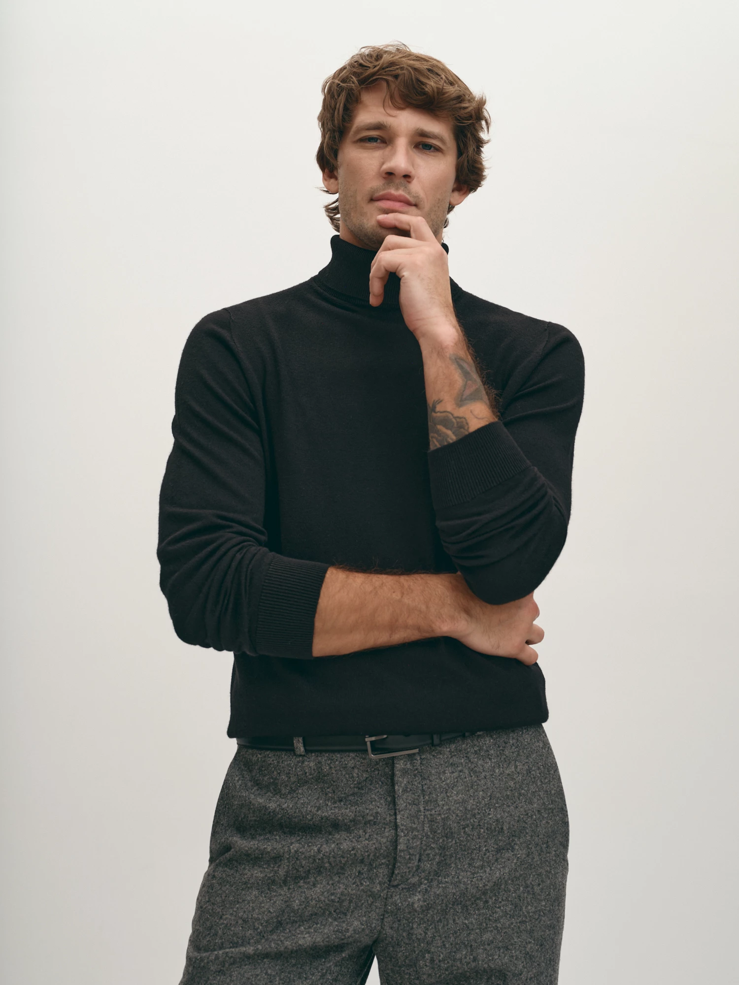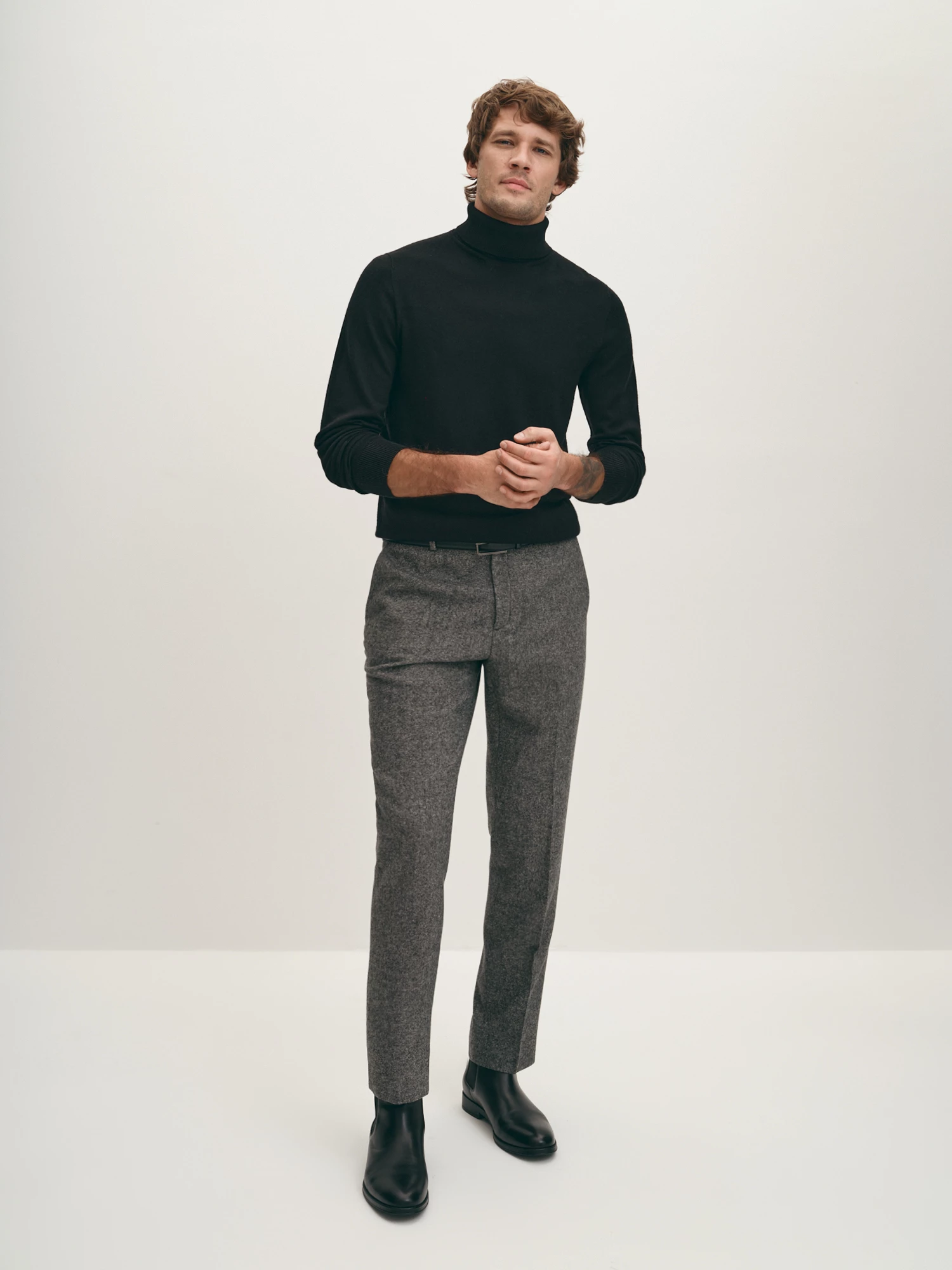 Вязаная водолазка базового чёрного цвета. Шерсть мериноса в составе надёжно сохраняет тепло, фирменная эластичная вязка обеспечивает комфортную посадку по фигуре. Модель прямого силуэта, с естественной линией плеча и длинным втачным рукавом. Воротник-стойка с отворотом, манжеты на рукавах и манжет по низу изделия - в мелкий фактурный рубчик. Уютная водолазка дополнит как лук в стиле кэжуал, так и нестрогий деловой образ.