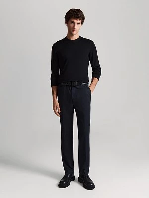 Универсальная вязаная водолазка тёмно-синего оттенка. Шерсть мериноса в составе надёжно сохраняет тепло, фирменная эластичная вязка обеспечивает комфортную посадку по фигуре. Модель прямого силуэта, с естественной линией плеча и длинным втачным рукавом. Воротник-стойка с отворотом, манжеты на рукавах и манжет по низу изделия - в мелкий фактурный рубчик. Уютная водолазка дополнит как лук в стиле кэжуал, так и нестрогий деловой образ.