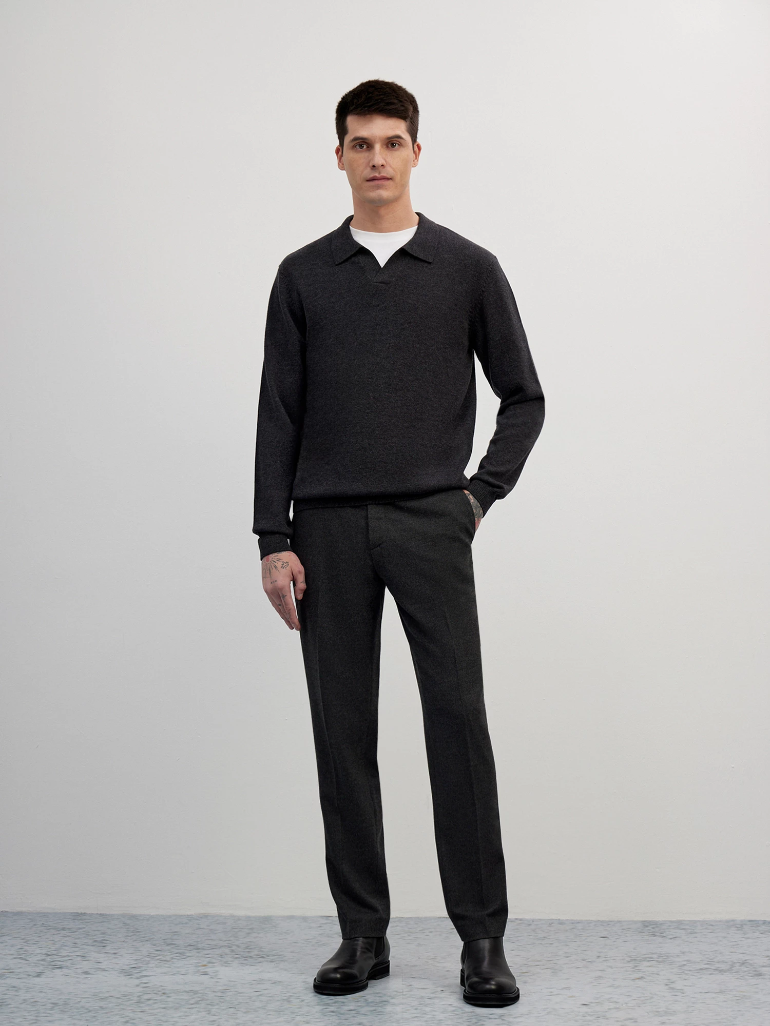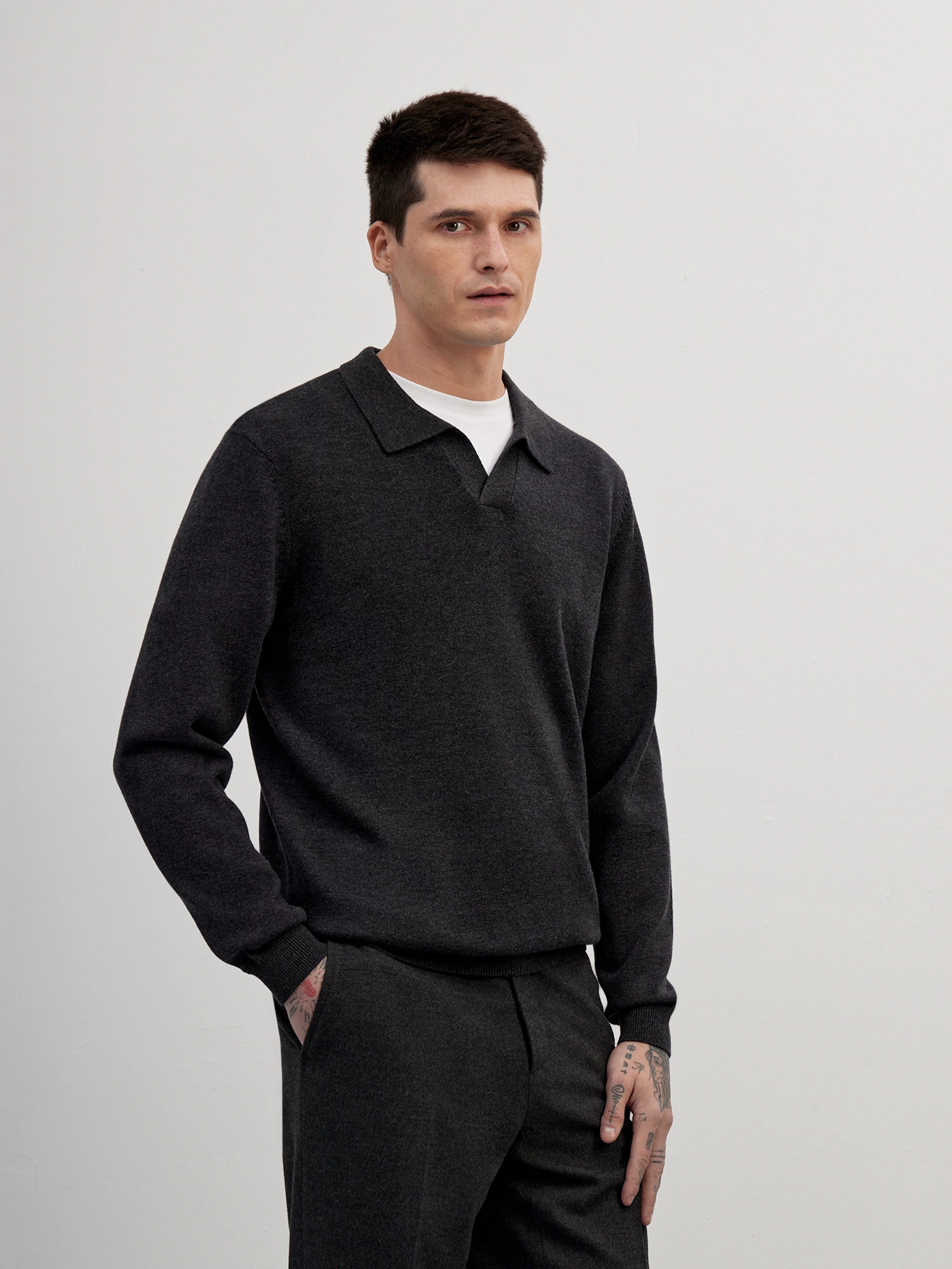 Вязаный джемпер с оригинальной V-образной горловиной и отложным воротником в стиле поло. Лаконичная база, которая подойдет для любого мужского гардероба. Средней плотности трикотаж из отборных волокон премиального хлопка и мягкой овечьей шерсти создает ровную фактуру и помогает изделию сохранять тепло. Благодаря прямому крою и резинке по низу изделия, джемпер отлично сядет на любой тип фигуры.