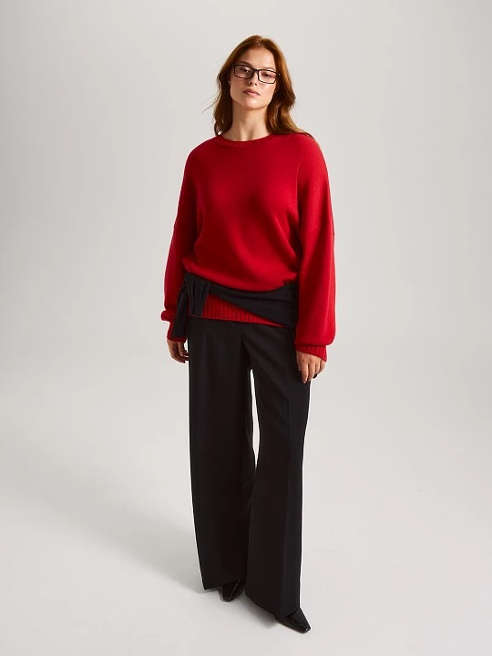 Джемпер с круглым вырезом и длинными рукавами, продукт высокоточной машины Shima Seiki, призван дарить не только тепло, но и безупречный стиль. Мягкие складки высоких манжет нежно обволакивают запястья, создавая ощущение защищенности и комфорта, а спущенное плечо добавляет образу непринужденную изысканность, делая силуэт женственным и пластичным. Асимметричный низ, где спинка чуть длиннее переда, придает модели динамичный современный характер — такой джемпер не просто согревает, но и визуально вытягивает фигуру, делая движения более выразительными, а образ — цельным и продуманным до мелочей. Связанный из премиальной пряжи с добавлением шерсти мериноса и хлопка — самого востребованного и любимого в России состава, — свитер сочетает в себе лучшее от натуральных материалов: нежную теплоту мериноса, который прекрасно регулирует температуру тела, и воздушную легкость хлопка, обеспечивающего невероятный комфорт. Деликатный благородный блеск пряжи придает вещи нарядный штрих, позволяя ей легко переходить из повседневных образов в более торжественные. Уверенный красный цвет - это мощный стилевой акцент, символ уверенности и страсти. Не просто одежда, а инвестиция в комфорт и уверенность.