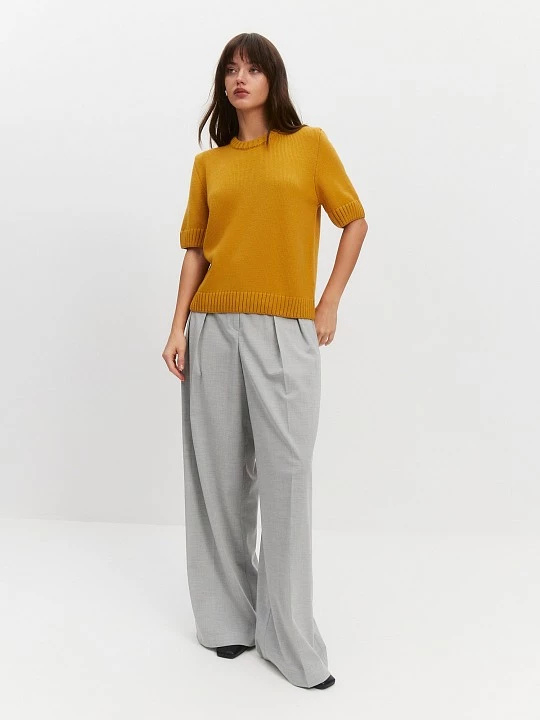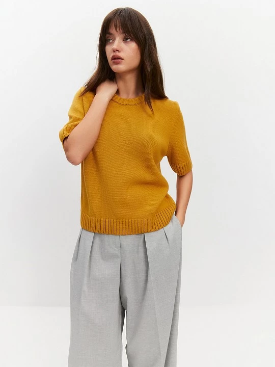 Джемпер гладкой вязки в желтом цвете из осенней палитры станет универсальной базой для Вашего гардероба. Он выполнен из качественной пряжи на основе шерсти мериноса, мягкой, эластичной и тактильно приятной.