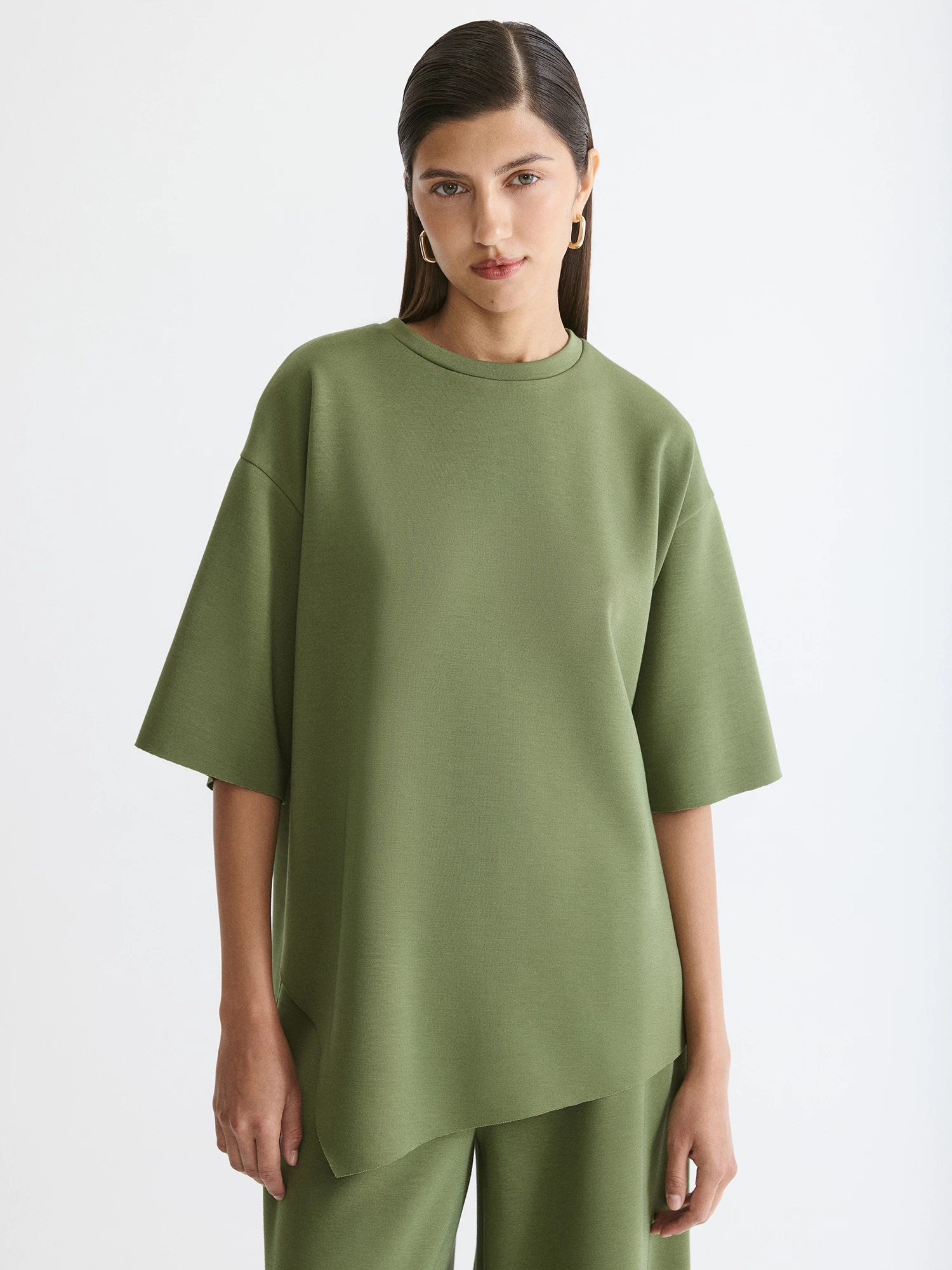 Комфортная юбка с необработанным краем в благородном оливковом цвете хорошо сочетается со свитшотом из неопрена BS0137K.
