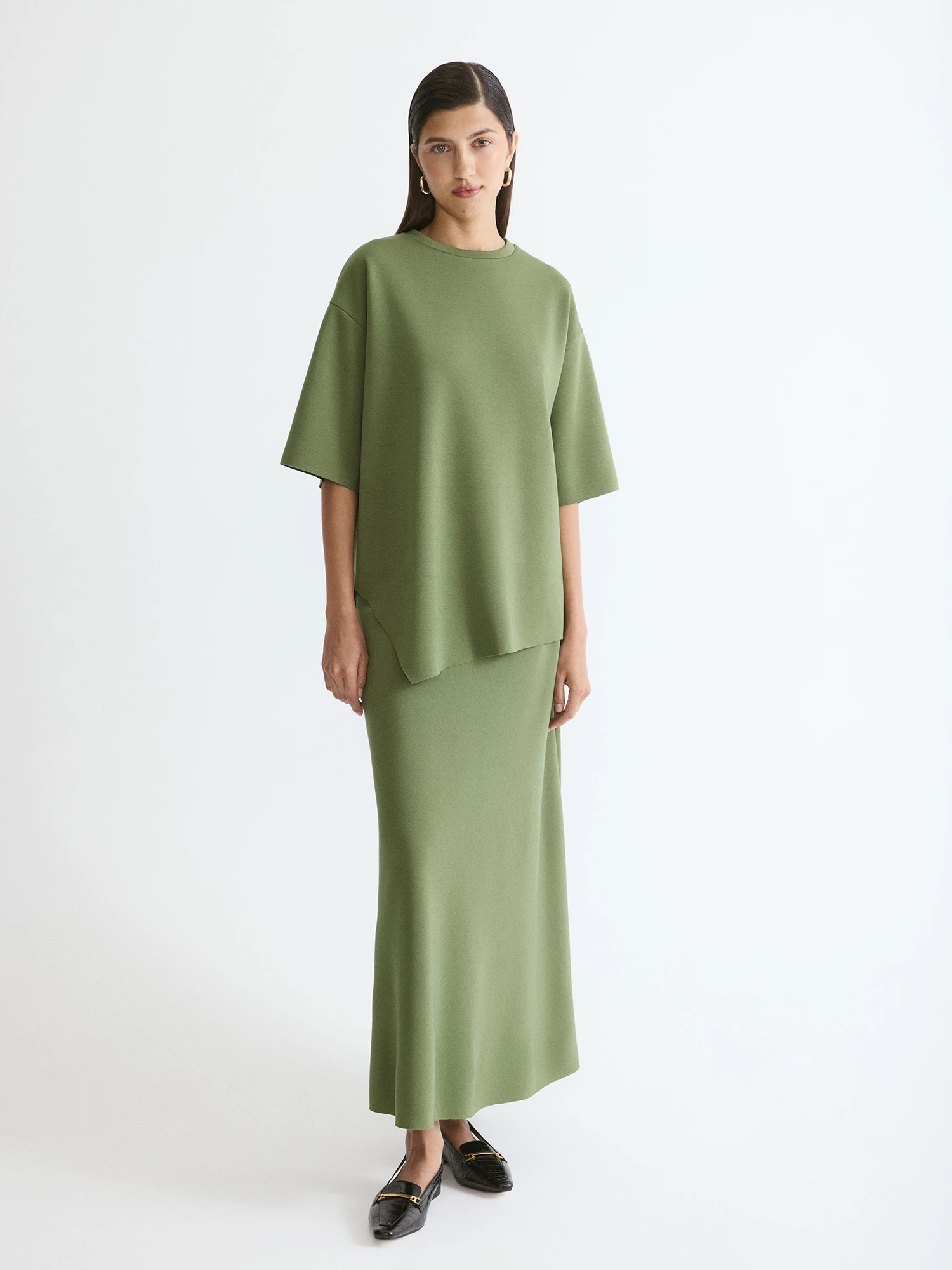 Юбка комфортного А-силуэта в благородном оливковом оттенке незаменима для повседневной носки. Модель выполнена с плавным расклешением, без притачного пояса, на резинке по талии с изнаночной стороны.
