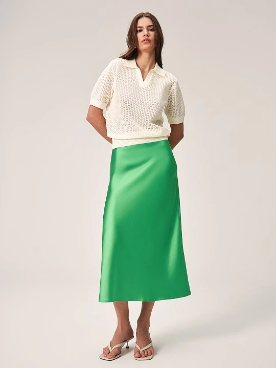 Юбка длиной ниже колен трапециевидного А-силуэта. Модель без притачного пояса с застежкой сбоку на потайную молнию. Юбка выполнена из высокотехнологичного полиэстера, волокна прочного, износостойкого. Спандекс в составе способствует формоустойчивости изделия. Плотная атласная ткань демонстрирует нюансные переливы света и цвета, а потому эффектно драпируется. Стильная юбка в цвете "зеленый шиповник" подходит для стиля спорт-шик, прогулки, школы, свидания, офиса. С соответствующим верхом юбка может быть востребована как праздничная, нарядная, новогодняя.