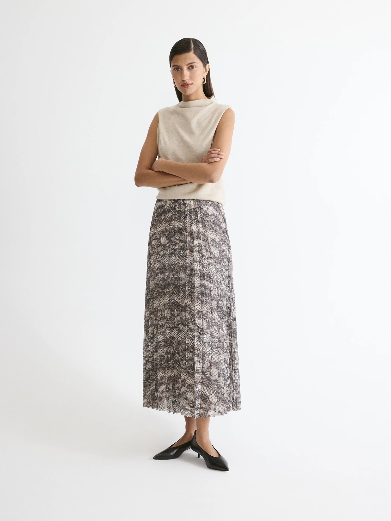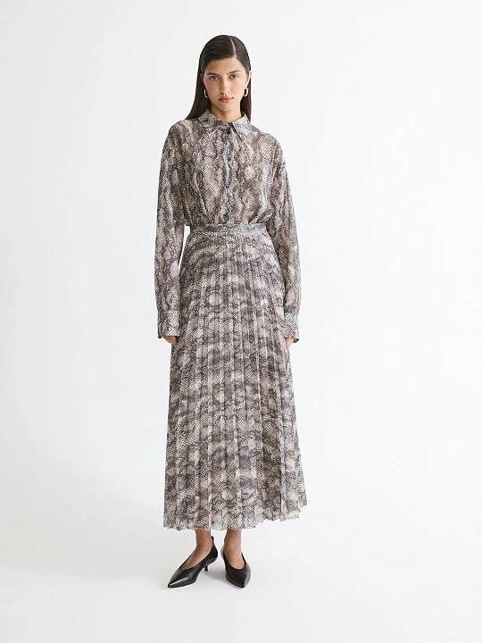 Юбка с серо-коричневым анималистичным узором "рептилия" создана для актуальных образов. Радиальное гофре, выполненное на специальном оборудовании, подчёркивает талию и не утяжеляет силуэт.