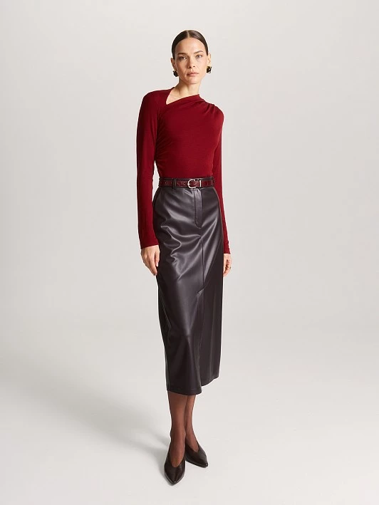 Для юбки выбрали плотную, шоколадного цвета экокожу с деликатным блеском и дополнили ее подкладкой для лучшей посадки. Такое полотно хорошо держит тепло и заданную форму.