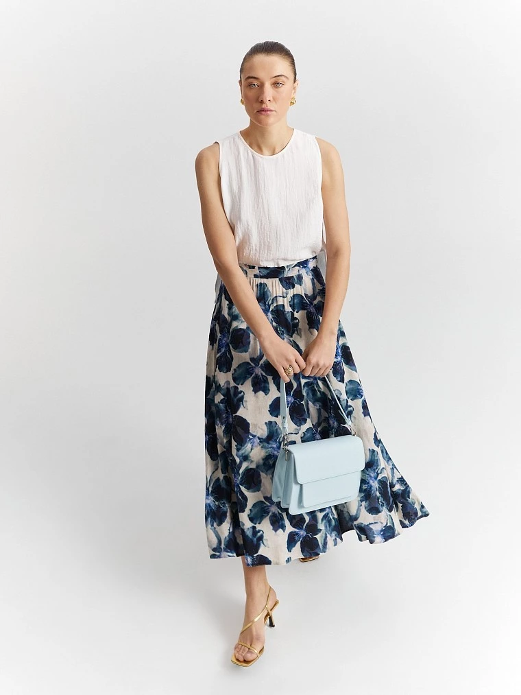 Женственная юбка-миди с воздушным цветочным принтом выполнена из экологичной ткани ECOVERO. Это легкое, дышащее вискозное волокно нового поколения. При создании одежды из такой ткани на 50% сокращается воздействие на атмосферу и водные ресурсы. Модель с застежкой на боковую молнию, без подкладки. Отрезной пояс и силуэт трапеция подчеркивают линию талии, добавляя образу женственности и привлекательности. В сочетании с лаконичными блузками или базовыми топами создаст нежный и романтичный образ на каждый день.