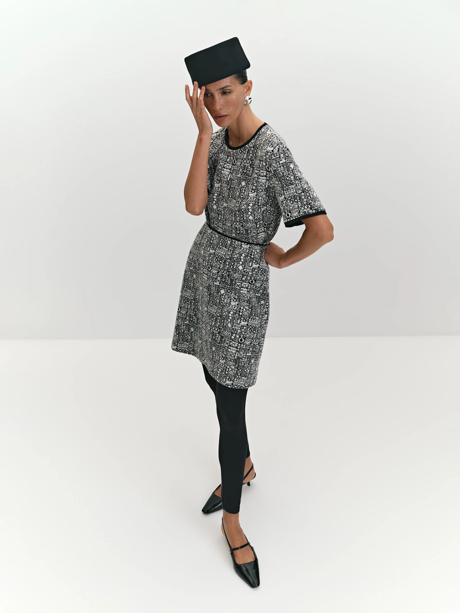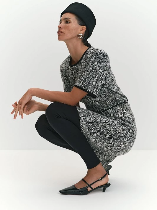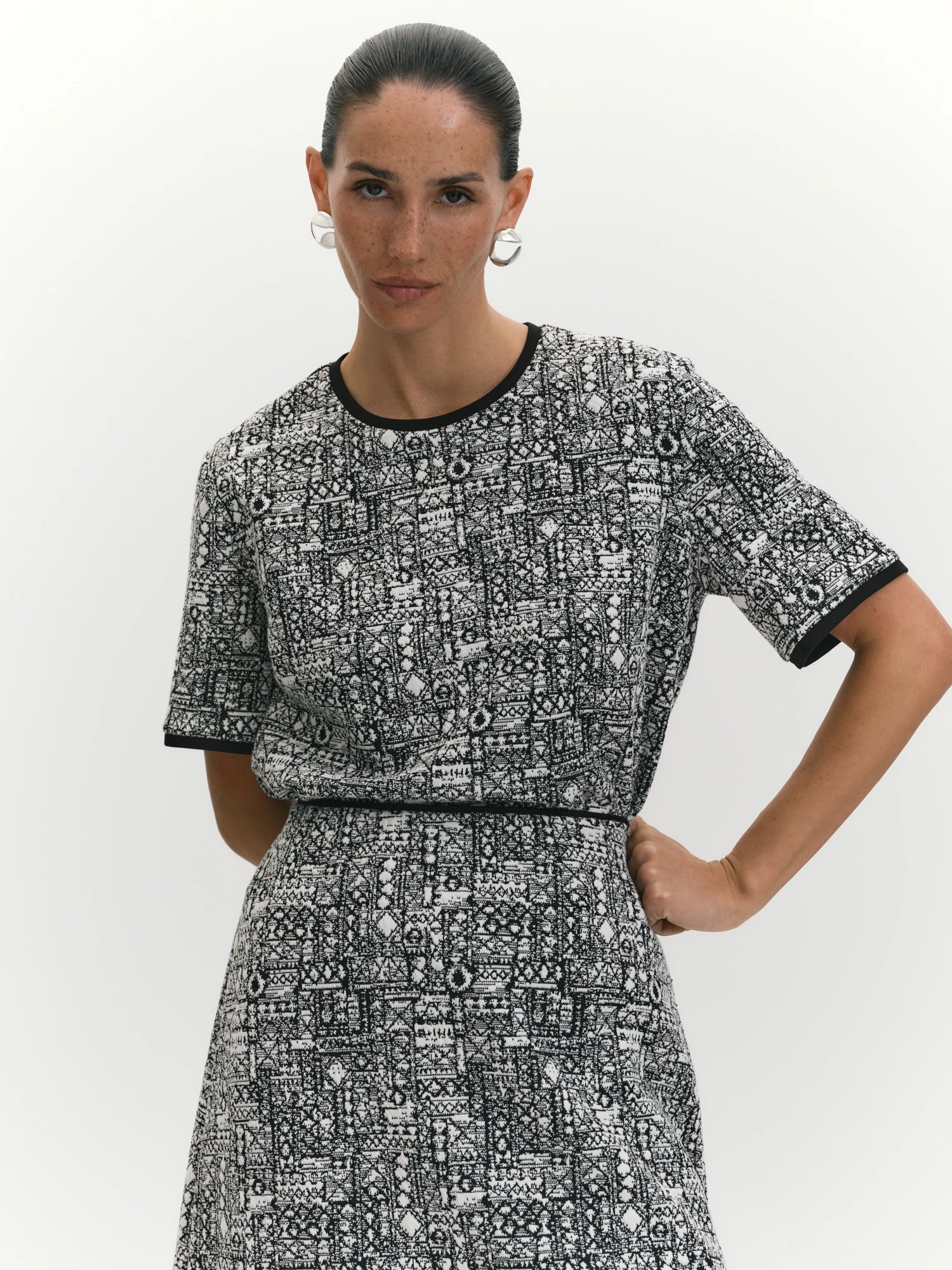 По сложности переплетения рельефный жаккард занимает, пожалуй, первое место. Благодаря такому способу производства, он прочен, долговечен и обладает привлекательным внешним видом. Такие характеристики жаккарда позволяют рассматривать его как долгосрочную инвестицию в предмет одежды, к тому же, благодаря хлопку, он особенно комфортен и воздухопроницаем. Сложность переплетения и акцентность фантазийного принта требует лаконичного кроя, а потому мы лишили юбку актуальной длины мини дополнительных деталей, лишь дополнив ее по поясу кантом из трикотажа рибана. Ахроматические черный и белый не подчиняются никаким правилам сочетания цветов, а потому универсальны.