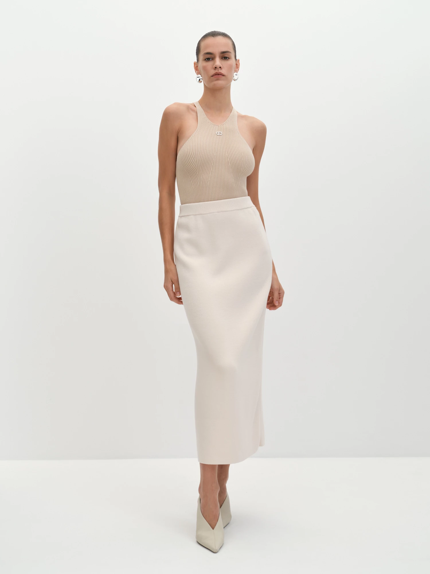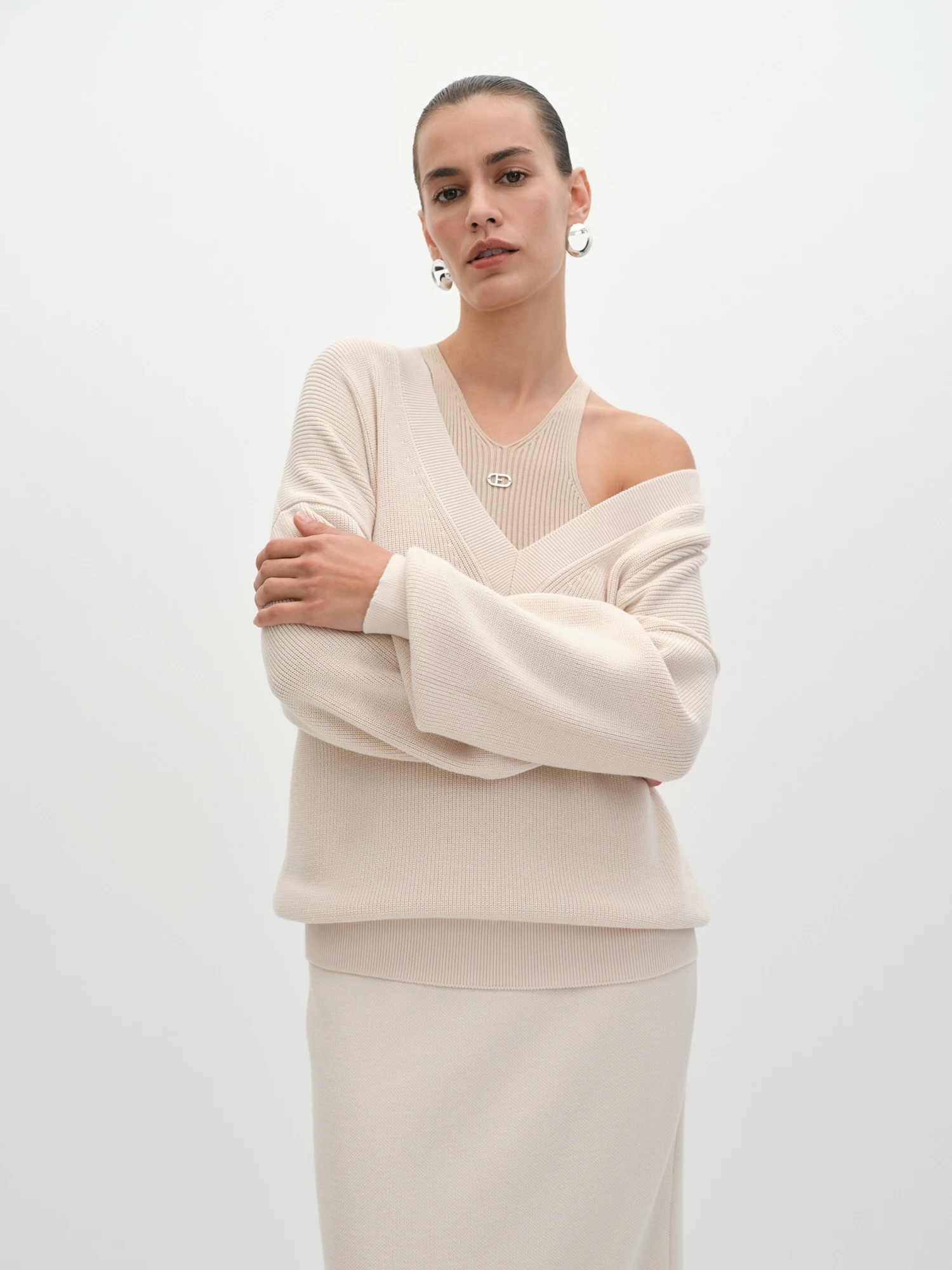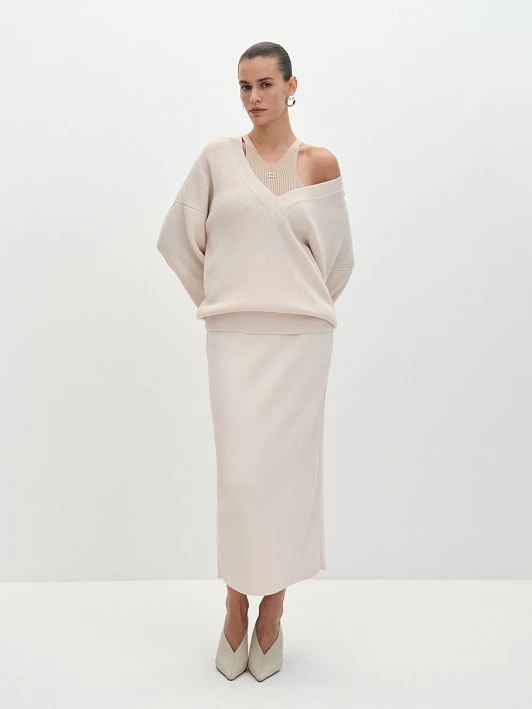 Лаконичная прямая юбка в трендовом сливочном оттенке хорошо балансирует джемпер большого объема из такой же пряжи. Модель выполнена на притачной резинке и с разрезом сзади для уверенного шага. При создании юбки использовано переплетение "жаккард", благодаря чему она формоустойчива и не подвержена растяжению при носке. Использовали для создания модели премиальную итальянскую пряжу с легким блеском, на 100% состоящую из хлопка, гипоаллергенного, тактильно приятного и дышащего. Детали модели вывязаны точно по лекалу на японской плосковязальной машине Shima Seiki, а значит изделие будет хорошо держать форму и долго прослужит. Соединительные швы выполнены на кеттельном оборудовании особым способом "петля в петлю", это премиальная, дорогая обработка, позволяющая получить эластичное соединение.