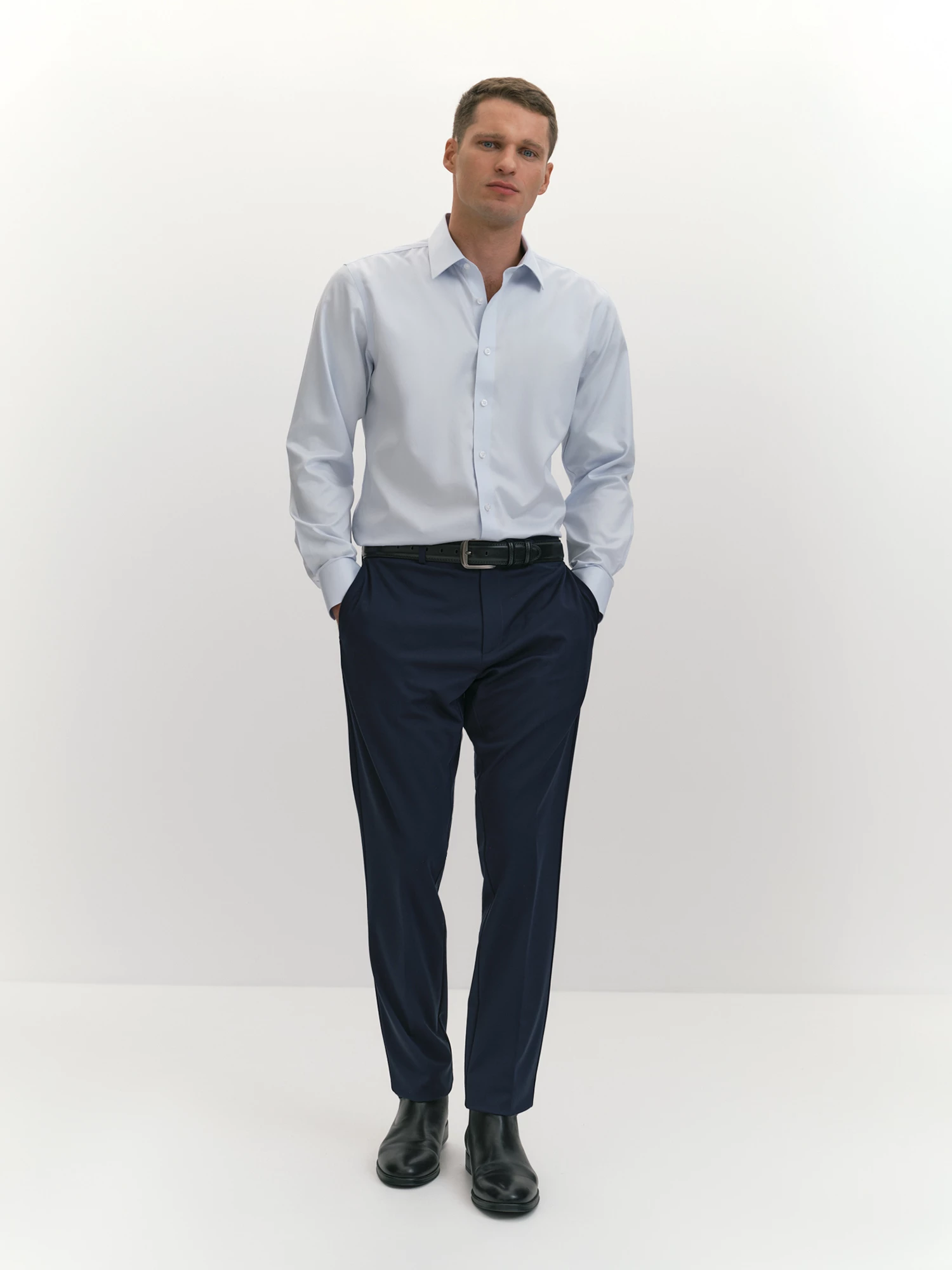 Брюки в стиле кэжуал — это сочетание комфорта, стиля и функциональности. Модель выполнена из трикотажного полотна на основе вискозы, нейлона и спандекса. Вискоза мягкая и комфортная, нейлон прочный и легкий, а спандекс эластичный и формоустойчивый, что делает брюки удобными для любых активностей. Темно-синий цвет модели универсален и подходит для создания как повседневного, так и стильного образа. Он сочетается с большинством оттенков и визуально стройнит, делая брюки практичным выбором для базового гардероба. Крой изделия подчеркивает его современный дизайн: притачной пояс со шлевками обеспечивает идеальную посадку и фиксацию на талии, а функциональные боковые карманы добавляют удобства, позволяя хранить мелкие предметы. Задние карманы с листочкой и фиксацией на пуговицу сочетают функциональность и элегантность, завершая образ. Силуэт slim fit подчеркивает стройность ног, создавая современный и ухоженный вид. Эти брюки — идеальный выбор для тех, кто ценит стиль, комфорт и практичность. Они станут универсальным элементом гардероба, подходящим для различных ситуаций и образов, подчеркивая внимание к деталям.